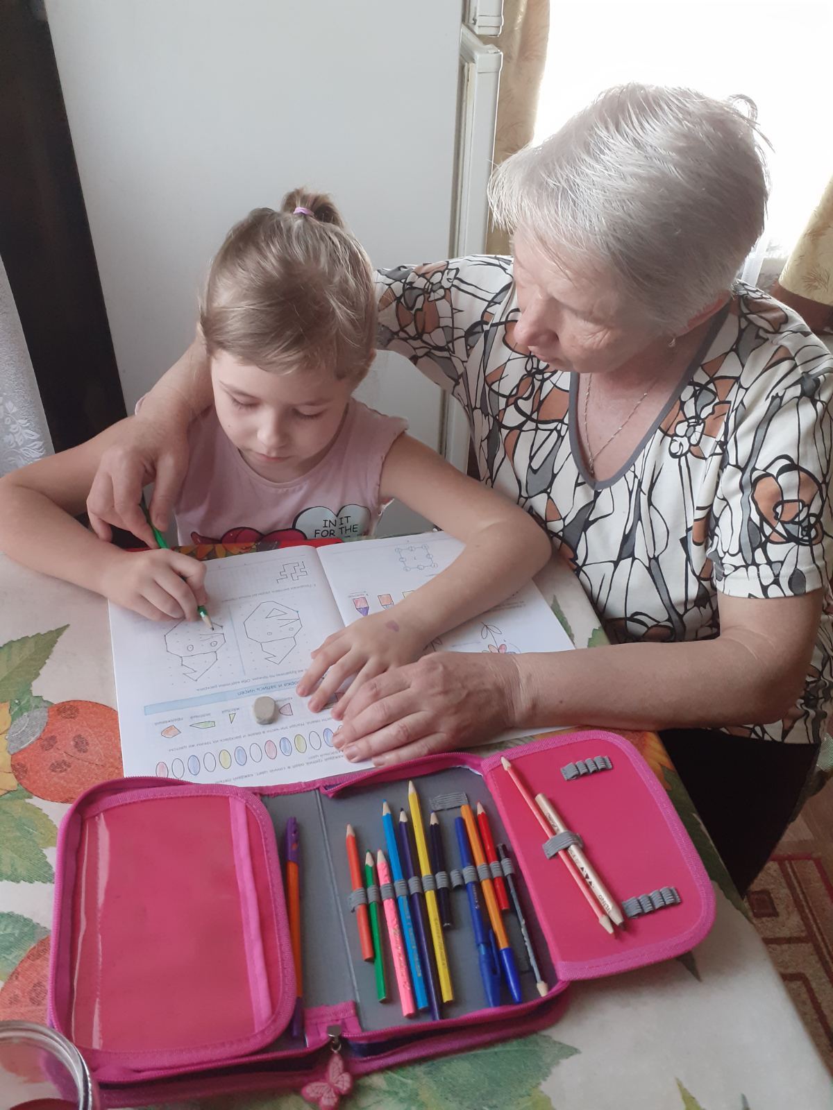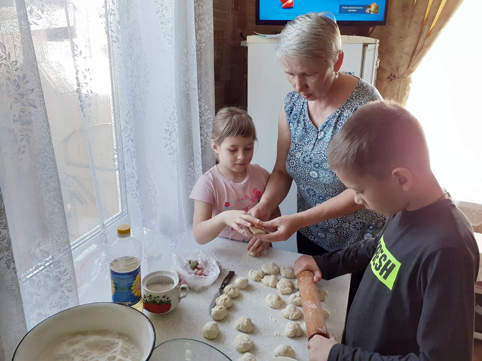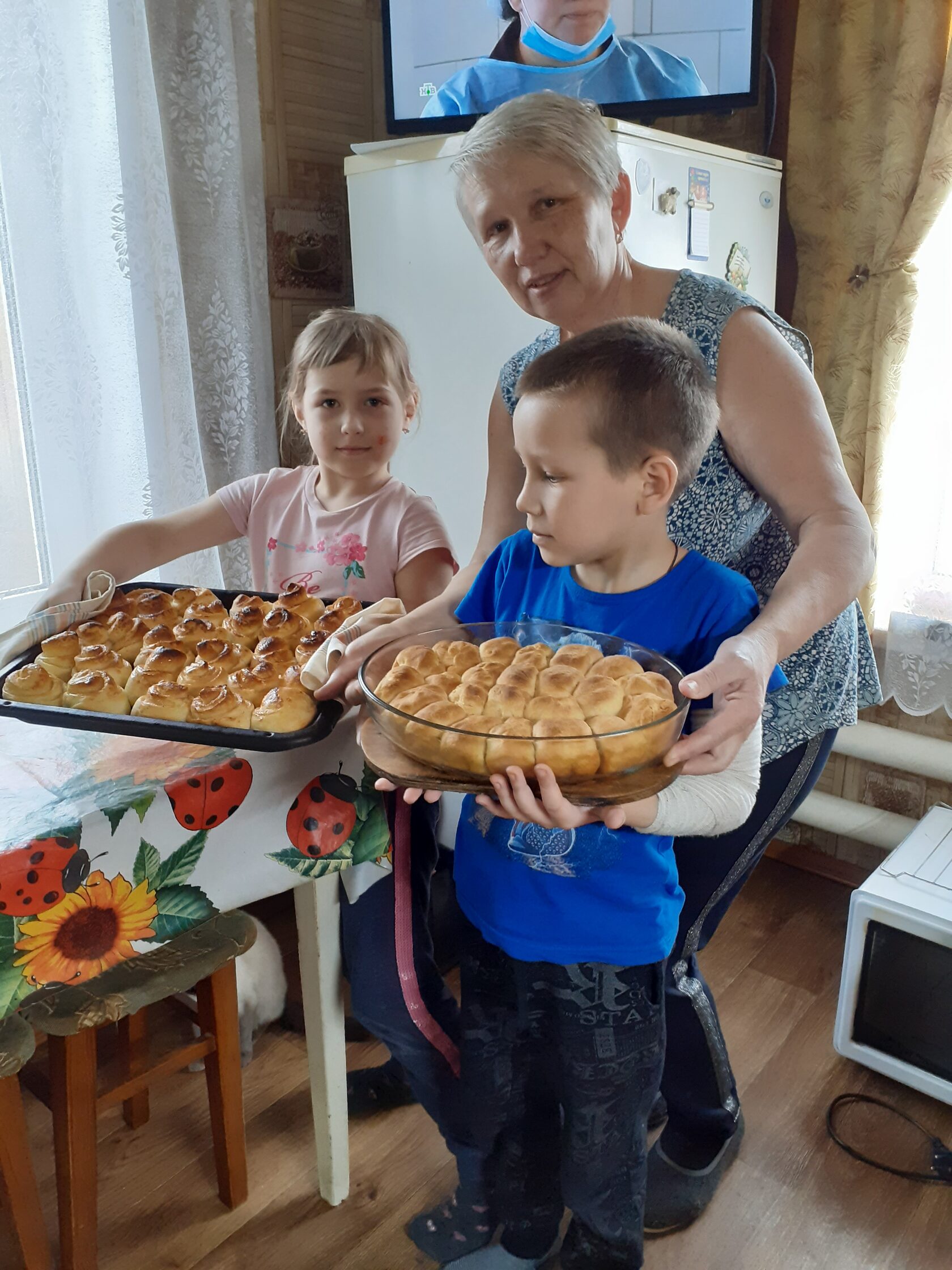 А с какой заботой и любовью относится Татьяна Сергеевна к своим внукам! Их у нее четверо, трое мальчиков и внучка Саша. Двое уже школьники, двое пойдут в этом году в первый класс. И чтобы родители не беспокоились за их здоровье, времяпрепровождение, развитие и спокойно продолжали работать, заботу о них на время всех каникул берет на себя бабушка. Вот и в эти весенние каникулы все четверо отдыхали у любимой бабули. Не только отдыхали, но даже кое в чем помогали. «Хотите вкусных пирожков – давайте стряпать вместе, хотите домашних пельменей – сейчас мы с вами их слепим и сварим», - неназойливо предлагает Татьяна Сергеевна. И неважно, что дети могут что-то просыпать, перепачкаться, главное, что они учатся трудиться. Бабушка находит свободное время поиграть с ними и книжку почитать, поговорить о правилах поведения и (что немаловажно!) научить ручку в руках держать правильно при письме и рисовании.