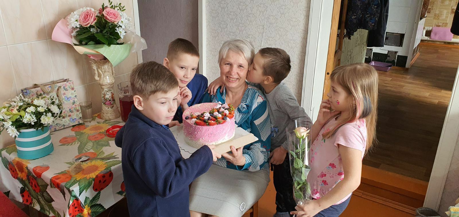 Внуки очень любят свою бабулю и потому уговорили родителей позволить им самим в юбилейный день рождения преподнести ей праздничный торт.