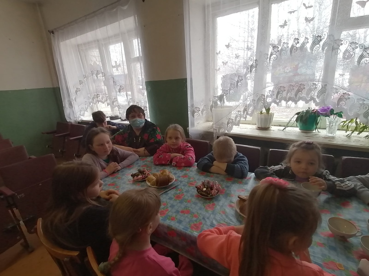 Затем было организовано чаепитие. Бабушки испекли блины и купили сладости.