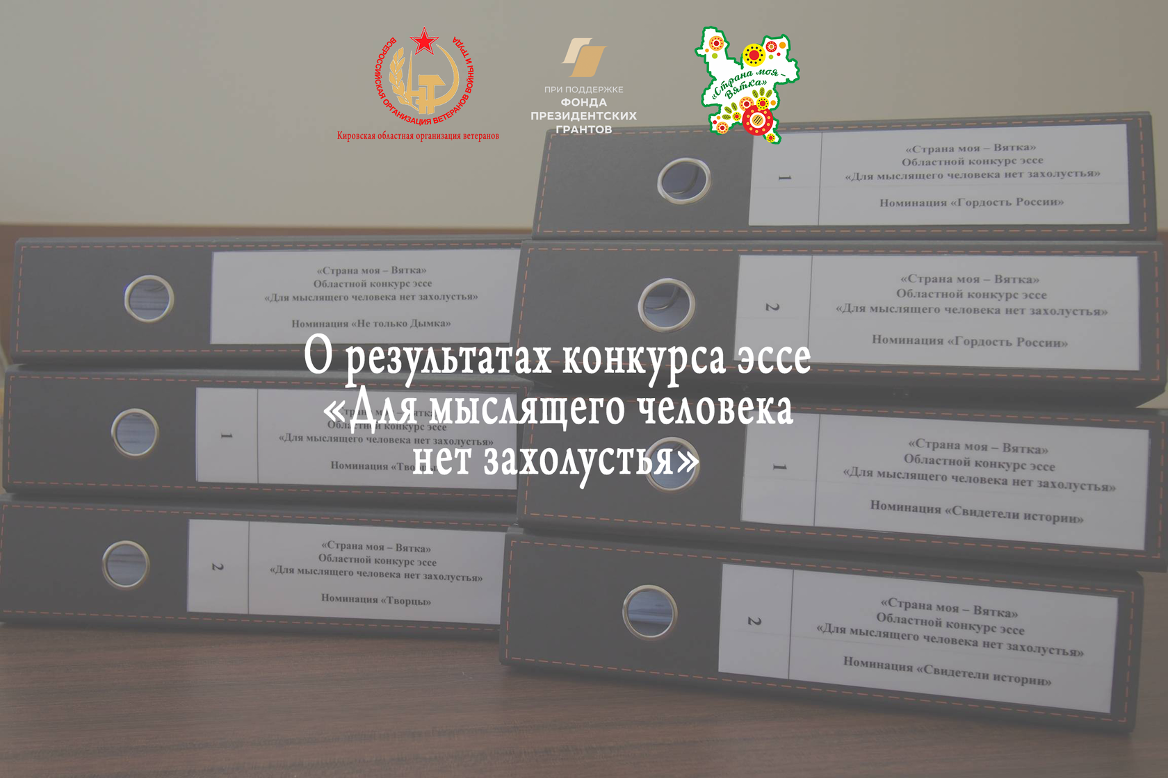 О подведении итогов областного конкурса эссе «Для мыслящего человека нет захолустья», реализуемого по проекту «Страна моя – Вятка», поддержанного Фондом президентских грантов.СЛУШАЛИ: Судовикова Михаила Сергеевича и Шарабарова Павла Николаевича, которые доложили о результатах оценки работ в номинации «Свидетели истории».