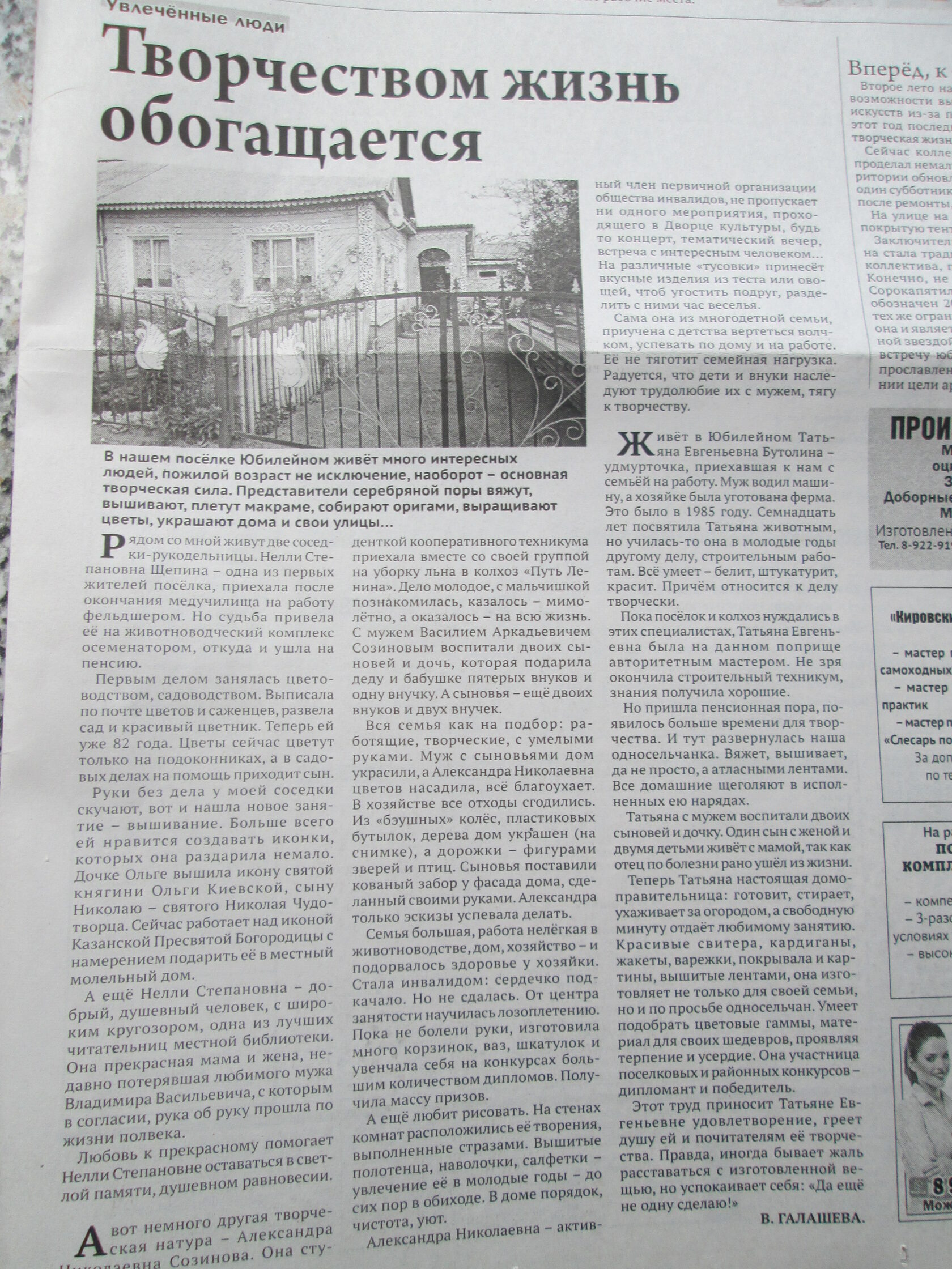 Ветераны посёлка – основная творческая сила. Представители «серебряного» возраста – вяжут, плетут макраме, собирают оригами, пишут стихи, поют песни, выращивают цветы, украшают свои дома, дворы и улицы, делая мир вокруг красивым и цветным.