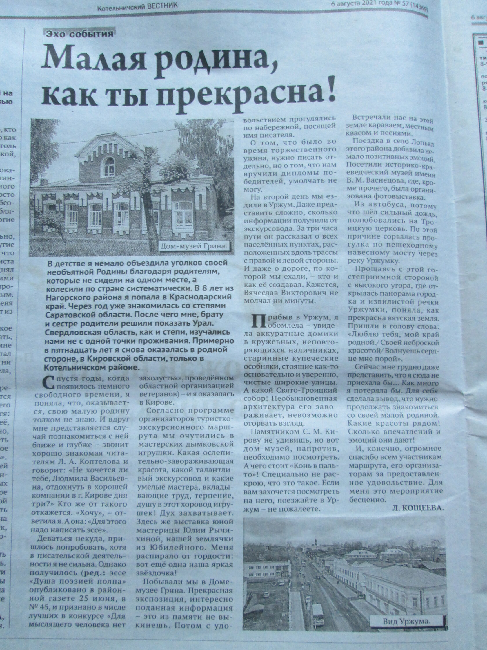 Вот такой отзыв о своей туристско-экскурсионной поездке в г. Уржум в составе группы ветеранов-победителей, написавших эссе на конкурс «Для мыслящего человека нет захолустья» в проекте «Страна моя - Вятка», написала в газету «Котельничский вестник» Людмила Васильевна Кощеева, член совета первичной организации ветеранов Юбилейного сельского поселения.