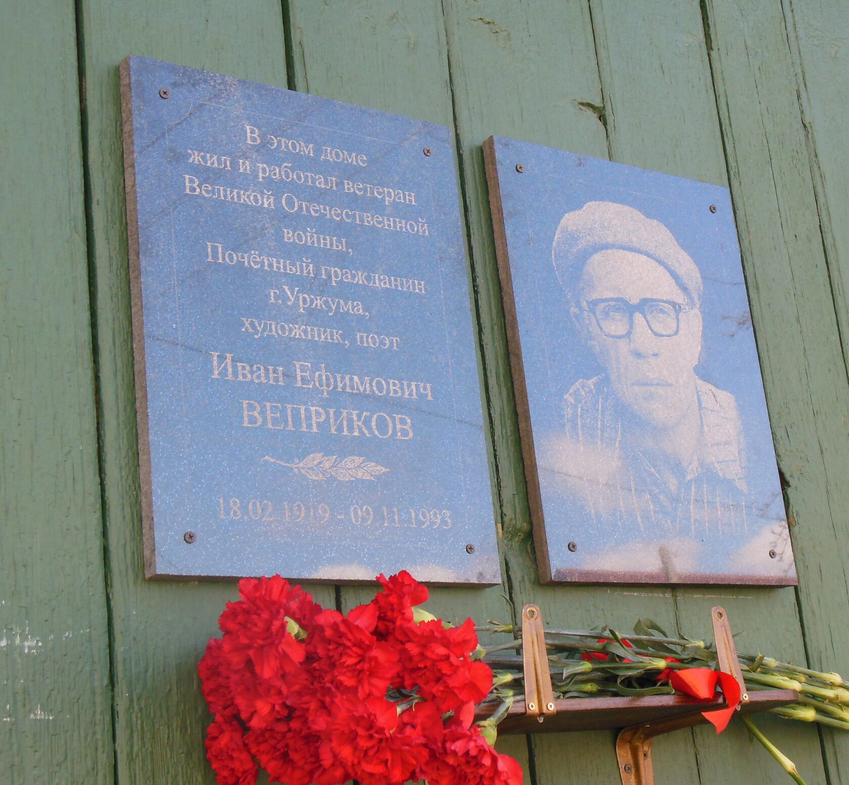 С ответным словом выступил Александр Иванович Веприков – продолжатель дела отца, заслуженный художник РФ, кавалер ордена Дружбы, также Почётный гражданин города Уржума. Ему и было предоставлено почётное право открыть мемориальную доску. Падает материал, и присутствующим открывается портрет на чёрном мраморе. Ефимыч, как называли его многие сверстники ветерана, изображён в своём обычном берете. Взгляд из-под очков устремлён вдаль...