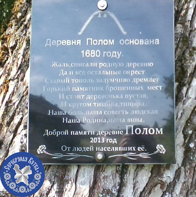 Последним жителем была моя собеседница Душкина Т.А. Она уехала из Полома в 2012 г. В 2013 г бывшие жители собирались на день деревни, В честь памяти деревни была прикреплена памятная доска на тополе у дома Душкиной Т. А.