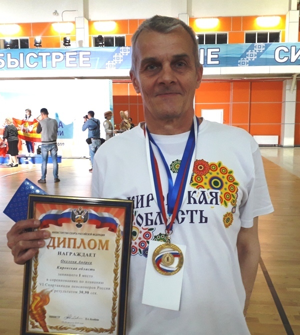 Победителем в плавании среди мужчин стал пенсионер из г. Кирово-Чепецка Андрей Иванович Окулов. Впервые в этом году медали в плавании и легкой атлетике разыгрывались в двух возрастных категориях – до 69 лет и 70 лет и старше. Кировский пенсионер соревновался в первой возрастной группе. Ему 60 лет и около 50 из них он занимается спортом. Залогом хорошего настроения пенсионер считает утреннюю десятиминутную зарядку. Также он ходит в спортзал, посещает бассейн и любит заниматься на уличных тренажерах. В настоящее время Андрей Иванович не работает, находится на заслуженном отдыхе. А раньше трудился слесарем по ремонту оборудования на Кирово-Чепецком химкомбинате. В 1975 году получил степень кандидата в мастера спорта по плаванию, являлся неоднократным победителем районных, областных и всероссийских соревнований.