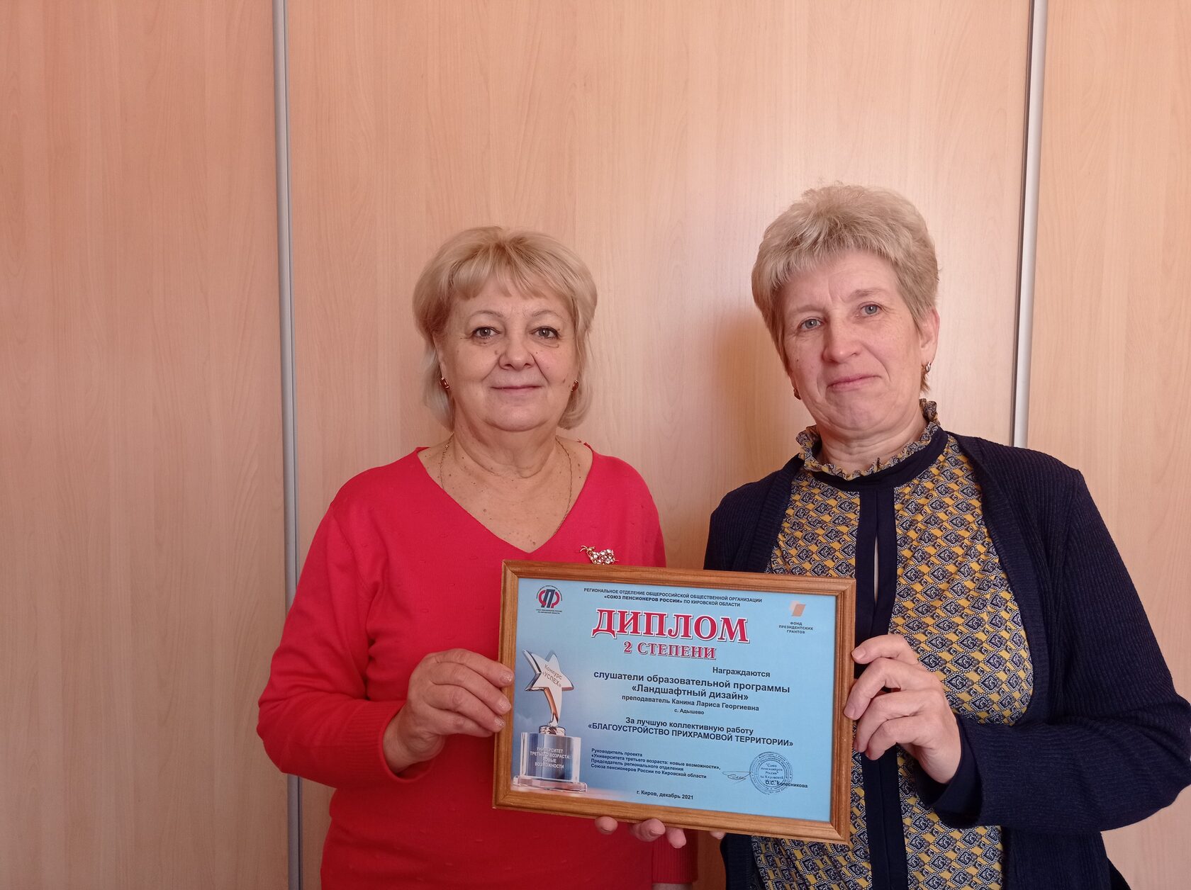 Дипломом 2 степени отмечена коллективная работа слушателей Университета третьего возраста по программе «Ландшафтный дизайн» по благоустройству прихрамовой территории с. Адышево.