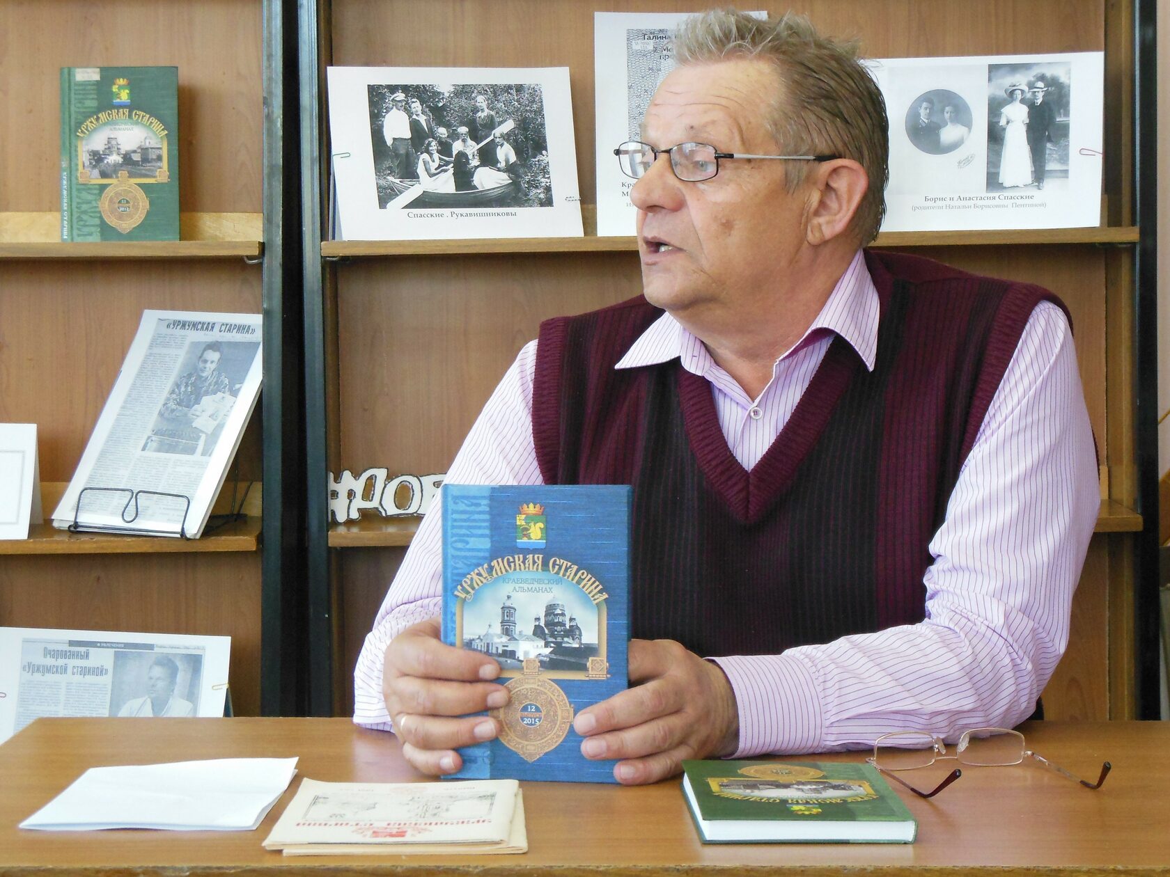 На фото автора: В. А. Ветлужских презентует читателям городской библиотеки 12-й выпуск краеведческого альманаха «Уржумская старина». Уржум, апрель 2016 г.