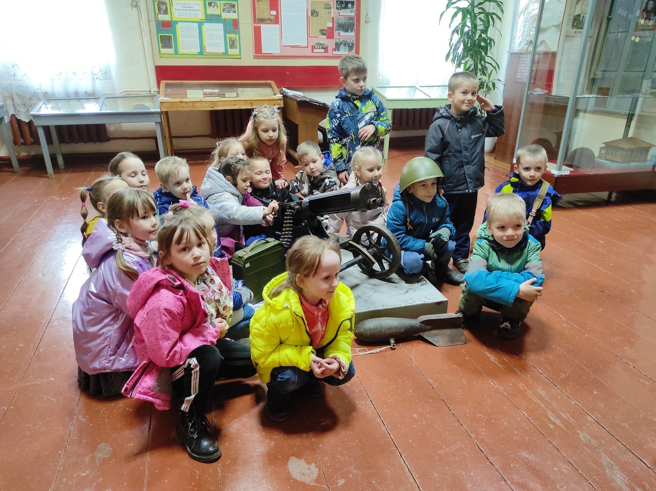 Внимание малышей во время рассказа экскурсовода привлекли военная форма, солдатская каска, другие предметы обмундирования солдат, портреты Героев Советского Союза. Но особое внимания ребят было направлено на излюбленный музейный экспонат всех детей – пулемет «Максим»!