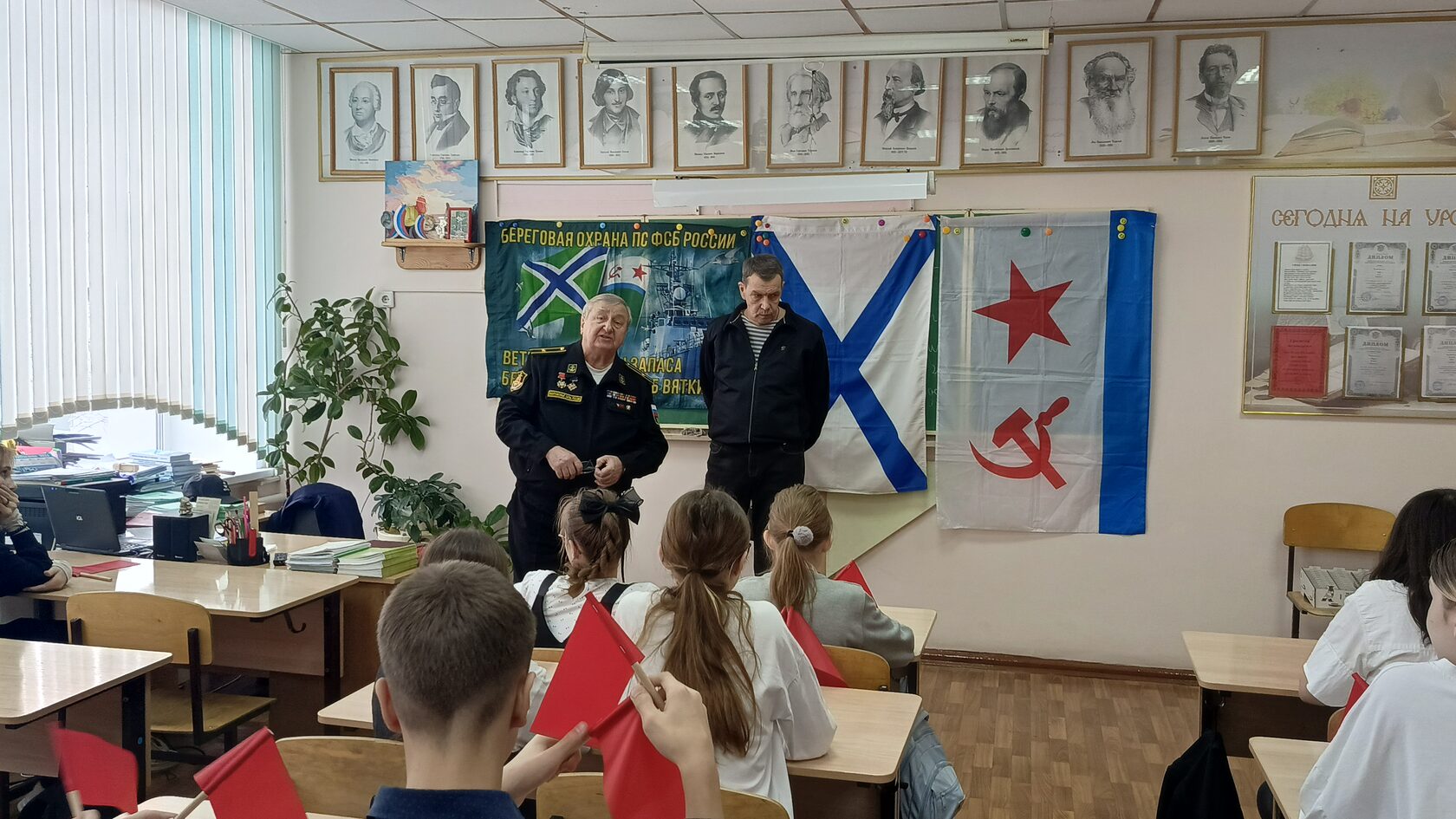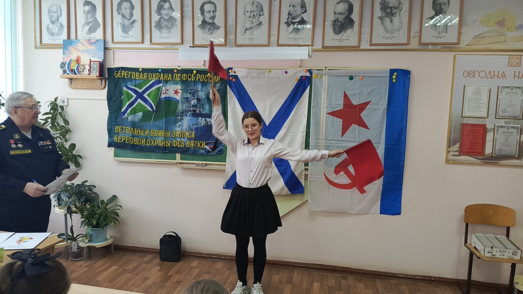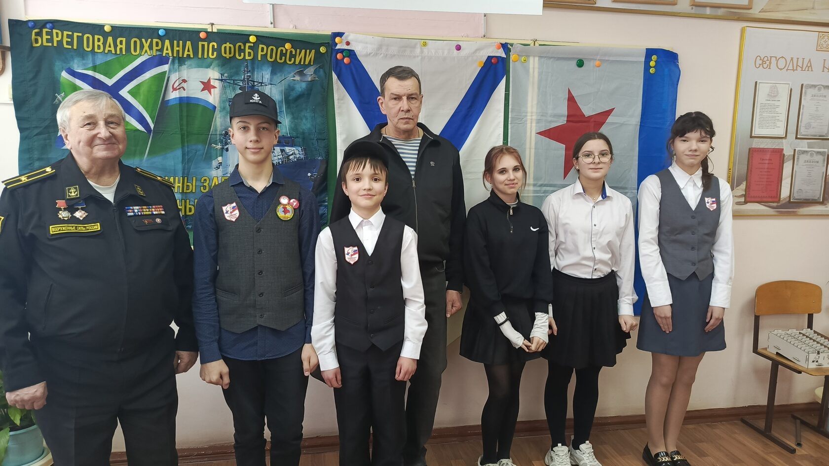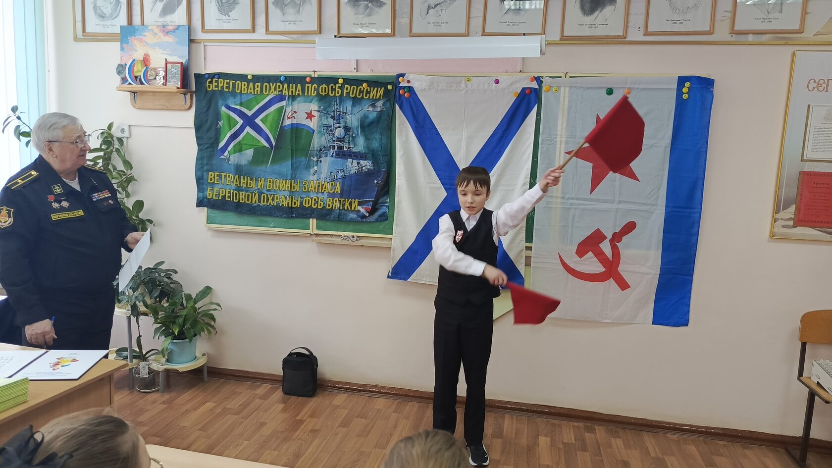 Зачет проводили: руководитель клуба, представитель Российского фонда ветеранов в Кировской области, председатель организации «Морские границы» КРО «Российский Союз ветеранов», капитан 3 ранга в отставке Ю.П. Малых, и активист объединения, служивший в 1980-1983 гг. в Отдельном Арктическом отряде на пограничной заставе Тикси в должности рулевого-сигнальщика на ПСКа с бортовым номером 168, старший матрос в отставке О.А. Мамаев.