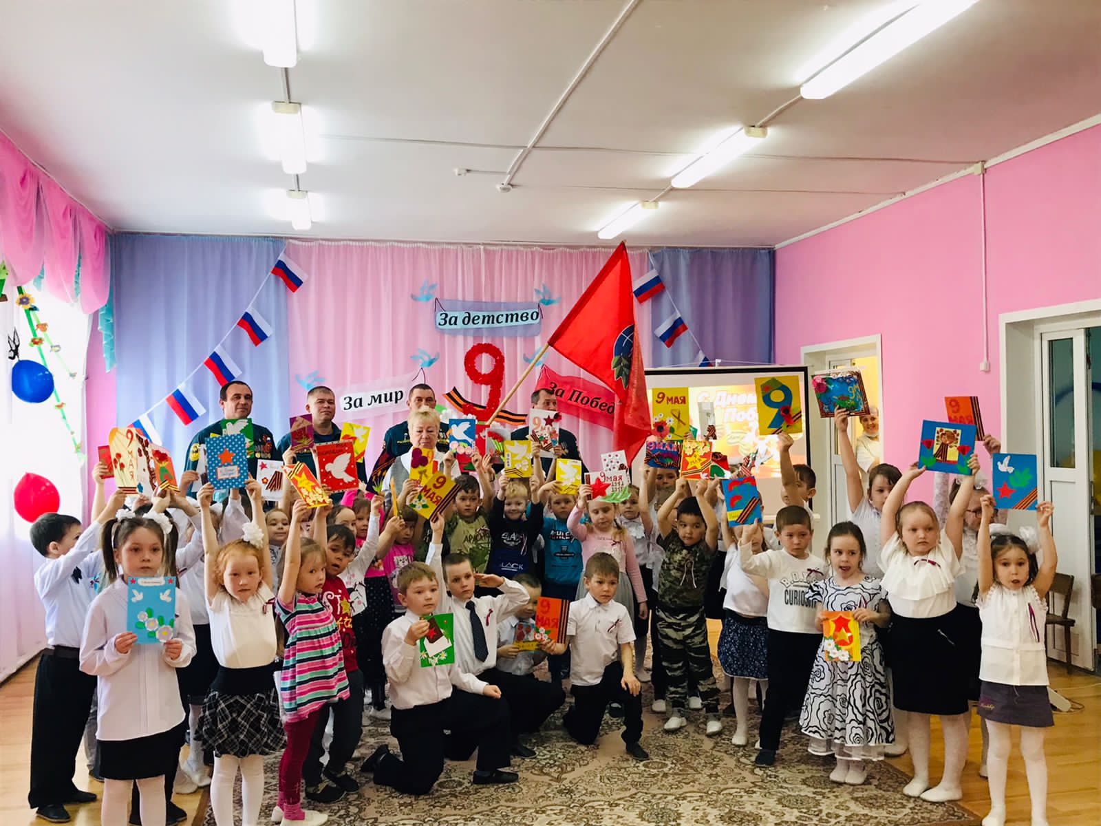 Члены «Боевого братства», участвующие в празднике, рассказали ребятам о своих заслугах, где воевали, за что получили свои медали и ордена. Все вместе пели песни, дети читали стихи, танцевали, а во дворе детского сада на импровизированном голубе мира приклеили пёрышки цвета российского флага.