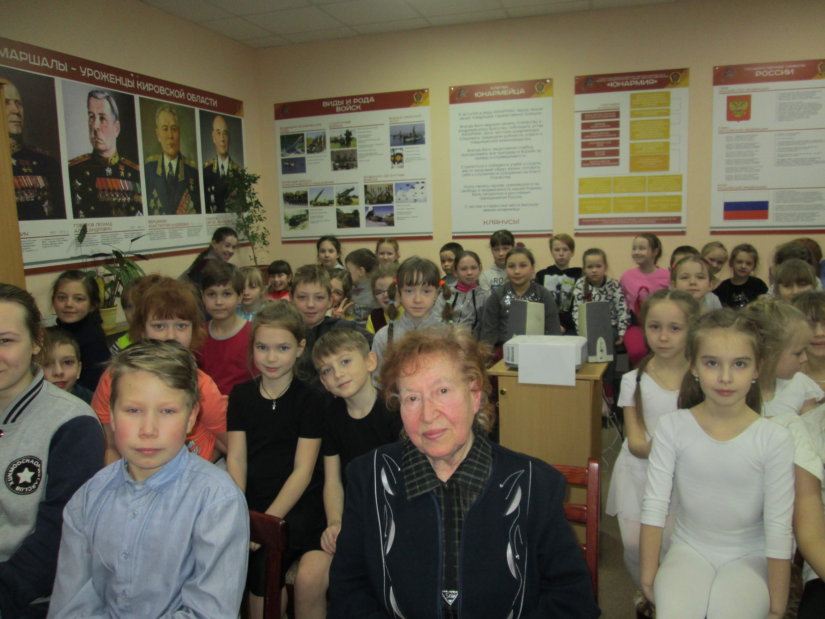 А на встречу с воспитанниками ЦДО пришла Ида Петровна Мосеева, она с сестрой была эвакуирована из Ленинграда в Котельнич. Отец Иды Петровны остался добровольцем защищать родной город, а матери только спустя месяц разрешили искать своих детей. Мама нашла их в Котельниче на вокзале. Первым местом их жительства был дом в деревне Микилята. Вселяли на уплотнение. Там семья Иды Петровны прожила целое лето, затем их перевезли в город на улицу Володарского. Здесь не было дров, мебели, нельзя было зажигать свет. Для сна им дали большой стол. Девочки много болели, постоянно были голодными. Несмотря на все невзгоды они выжили благодаря помощи со стороны котельничан. Ида Петровна выросла, стала врачом и долгие годы работала заведующей городской поликлиникой. Она пользуется заслуженным уважением у котельничан.