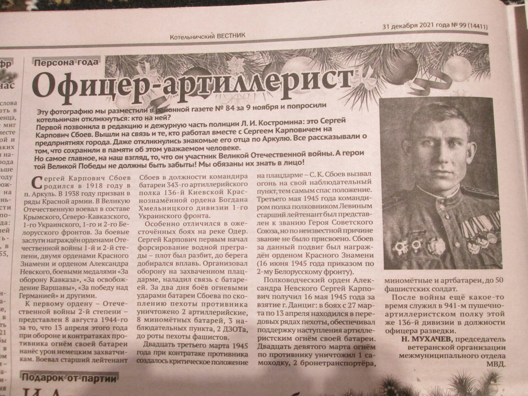 Районная газета «Котельничский вестник» продолжает публиковать на своих страницах материалы о героях былой войны. Эту заметку написал Н. Н. Мухачев – председатель первичной организации ветеранов межмуниципального отдела МВД «Котельничский». Николай Николаевич ведёт большую работу по сбору информации и материалов о ветеранах, служивших в разные годы в рядах доблестной милиции.