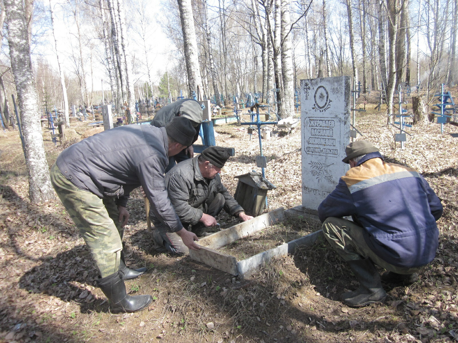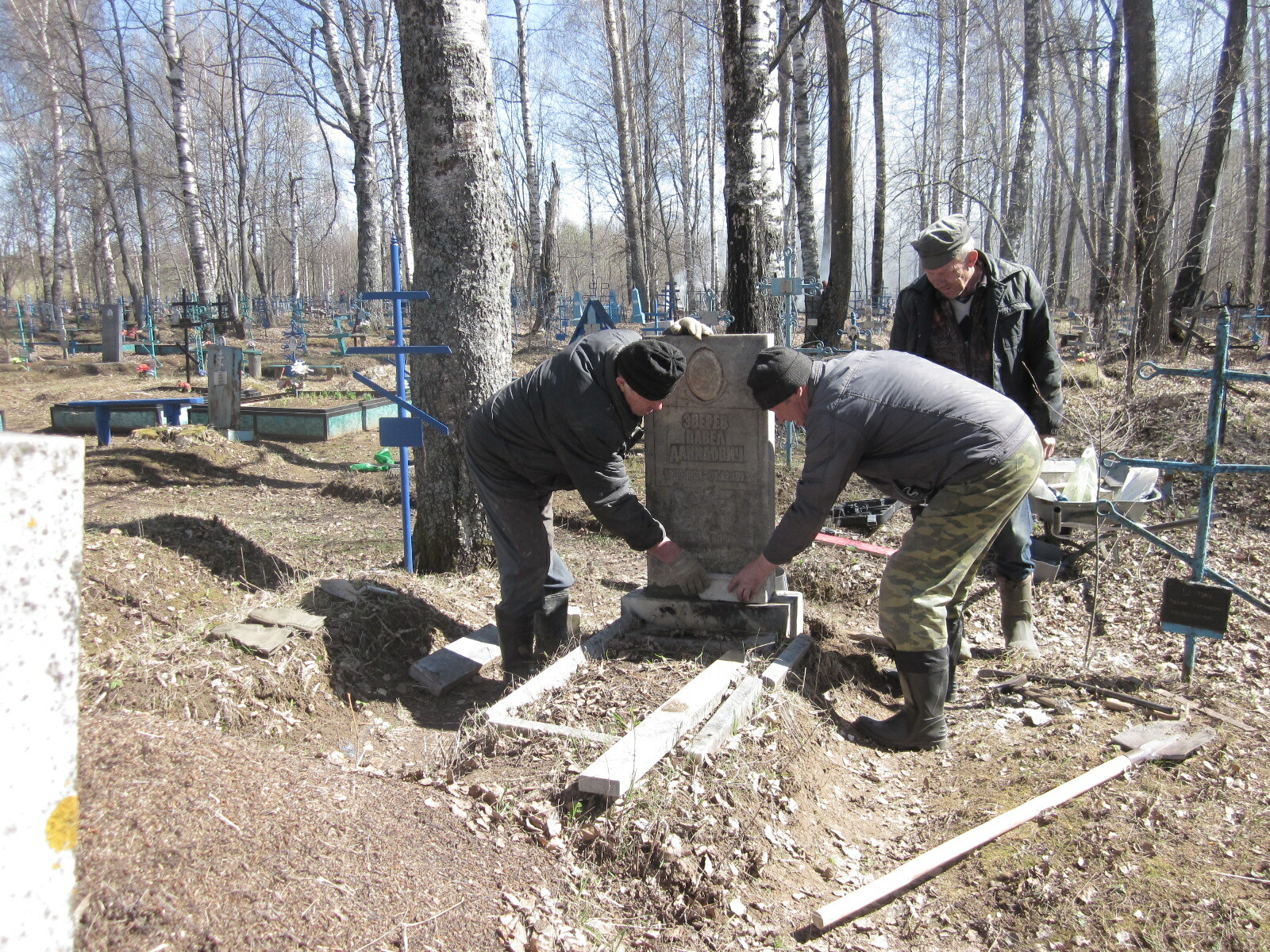 Этой весной обеспокоенность вызывали несколько могил: упавшая плита на одной из могил, на другой – развалившаяся цветочница, а на третьей - сильно наклонившийся памятник. Администрация терротдела пыталась связаться с родственниками, но всё безрезультатно. Тогда решили своими силами решить проблему. Наши активисты-волонтёры Головин Вячеслав Геннадьевич, Золотов Сергей Петрович и Созинов Вячеслав Петрович взялись за дело. Собрав необходимый материал и инвентарь, выполнили необходимые работы на могилах ветеранов Великой Отечественной войны: подняли и установили заново плиту на могиле Зверева Павла Даниловича, выправили накренившийся памятник на могиле Курочкина Михаила Архиповича и отремонтировали цветочницу на могиле Журавлёва Василия Яковлевича.