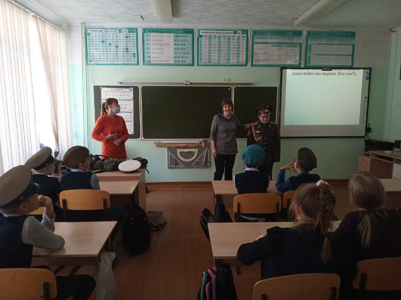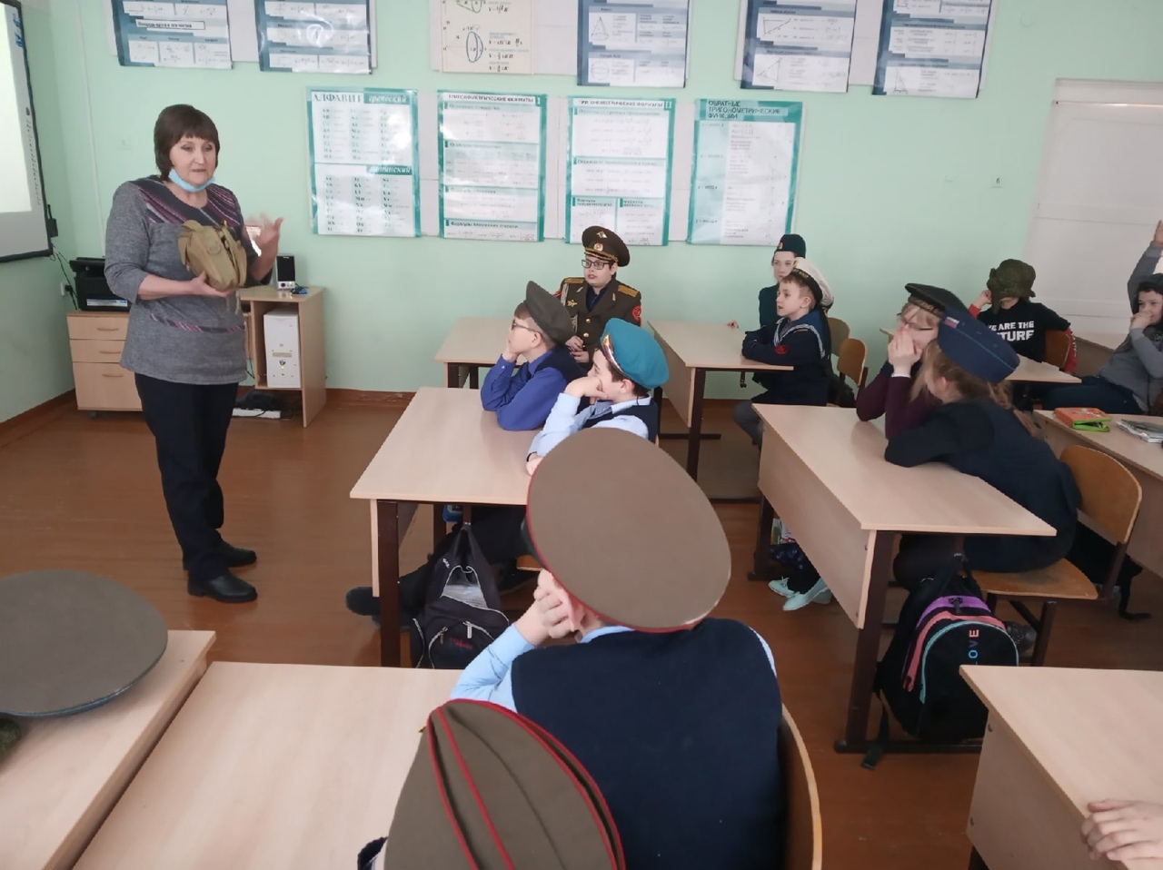 25 января организаторы побывали в гостях у ребят 5 класса Лугоболотной средней школы. Валентина Ивановна Кислицына, член бюро районной ветеранской организации, провела Урок Мужества "Я служу России". Из презентации школьники узнали про виды и рода войск Российской Армии, но больше всего ребят заинтересовали военная форма и макеты оружия. Дети с интересом рассматривали военную форму Советской и Российской Армии разных лет, возможно, подобную носили их дедушки и отцы. Привлёк внимание детей и армейский несессер, выдаваемый всем призывникам, которые отправляются на службу в современную российскую армию. Ребята с удивлением рассматривали, что в нем лежит.