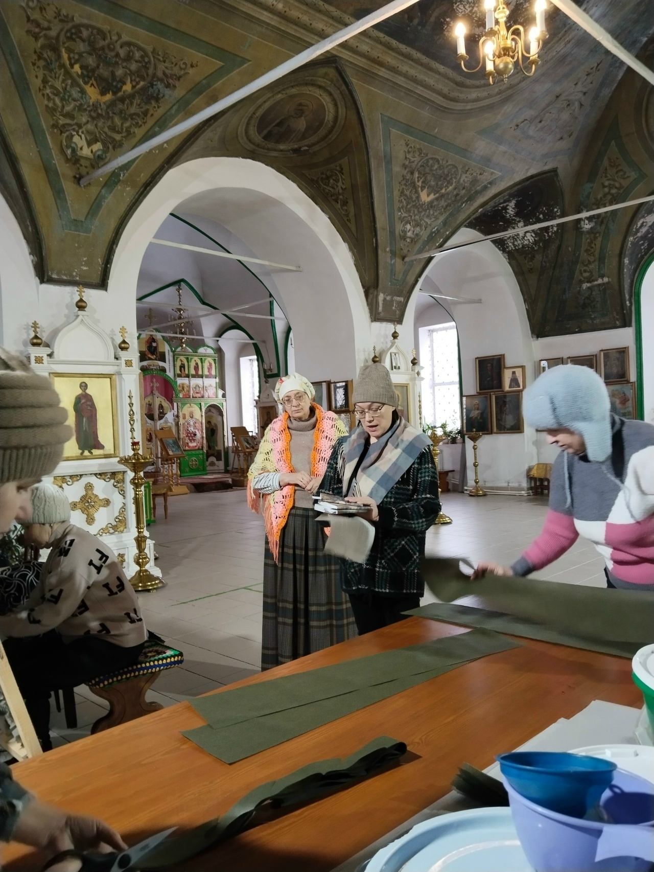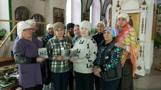 Женщины заинтересованно отнеслись к новым книгам, появившимся в местной библиотеке. В церкви, где они собираются для помощи фронту уже третий год, прохладно, поэтому слушали, не отрываясь от работы, но все три сборника были взяты для чтения. Среди «серебряных» волонтеров есть матери участников СВО.