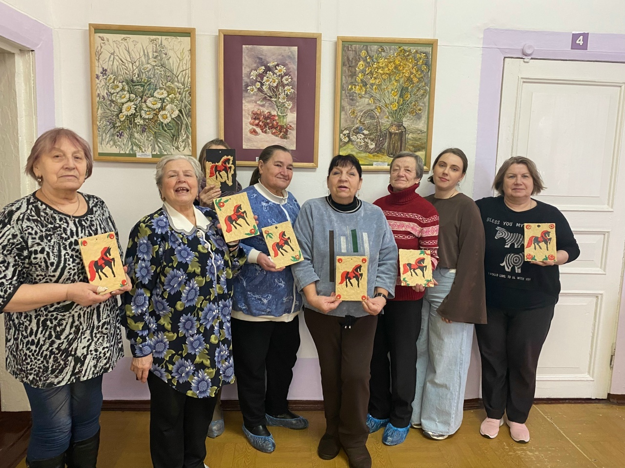Диана Владимировна рассказала гостям о промысле «Городецкая роспись», о его особенностях, потом выдала каждому исходные материалы и под её руководством ветераны изготовили символ 2026 года – Лошадь.