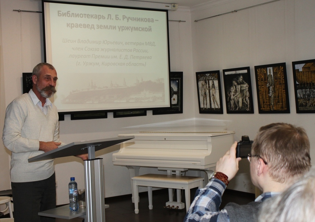 Тема выступления члена бюро Совета Уржумской районной организации ветеранов, члена Союза журналистов России В.Ю. Шеина была «Библиотекарь Л.Б. Ручникова – краевед земли уржумской».