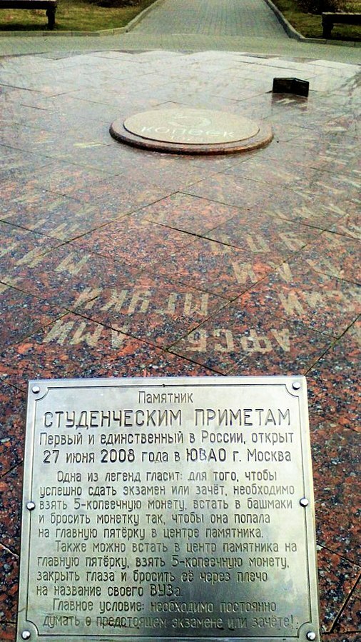 Считается, что он гарантирует получение пятерки на экзамене. Этой студенческой примете даже посвящен памятник «Счастливый пятак», торжественно открытый в 2008 году районе Марьино, в парке 850-летия Москвы. Это первый и единственный в России памятник студенческим приметам. Огромная гранитная 5-копеечная монета образца 1978 года, лежащая в центре 5-метровой композиции, на небольшом возвышении в центре круга, в который вписаны названия практически всех столичных ВУЗов.