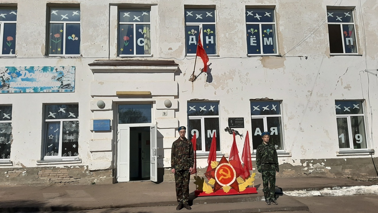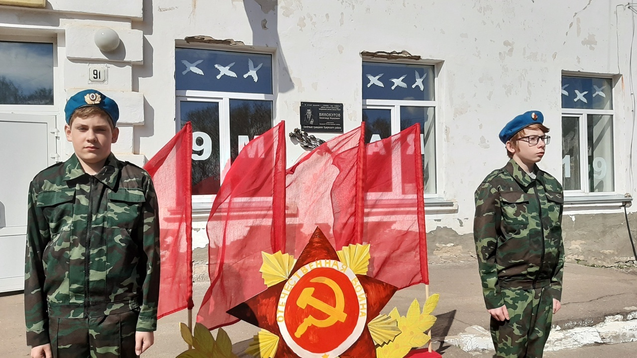 Позади Почётного караула, в окнах школы, – символика Победы – алые гвоздики, салюты, пятиконечные звёзды и много-много журавлей в память о тех, кто погиб, защищая Отчизну. На стене школы, у входа, – мемориальная доска ветерану педагогического труда, участнику Великой Отечественной войны А.Ф. Винокурову. Александр Фёдорович сражался с немецко-фашистскими захватчиками в танковых войсках, бои закончил в поверженном Берлине. В 2002 году ветеран удостоен звания «Почётный гражданин Уржумского района».