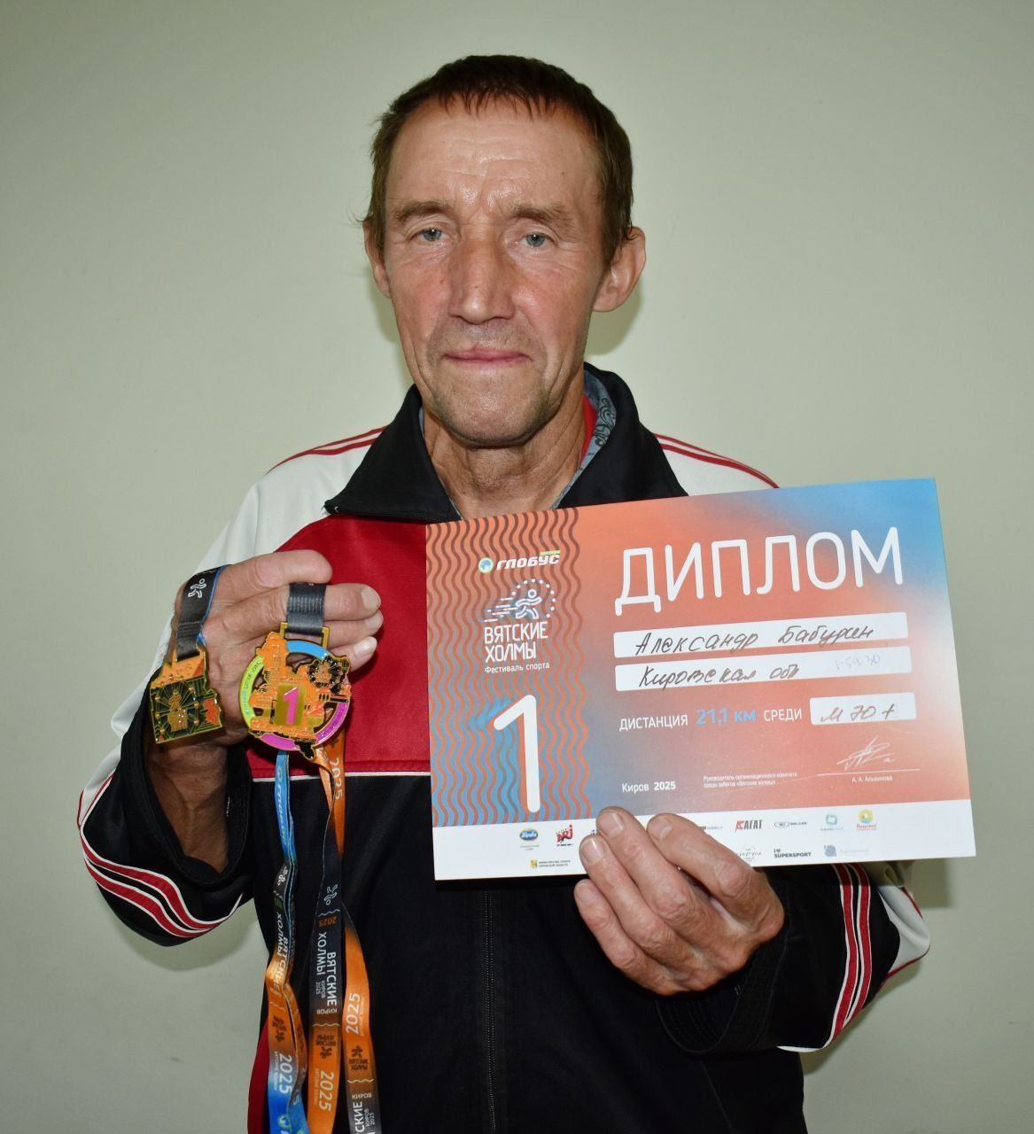 Омутнинский легкоатлет-ветеран в очередной раз принимал участие в областном полумарафоне «Вятские холмы». В этом году на старт юбилейного десятого массового забега встали сотни участников со всей Кировской области. Омутнинский район представлял Александр Бабурин. Трасса «Вятских холмов» оправдывает свое название. Она - рельефная и скоростная за счет многочисленных спусков. Полумарафон — это 21,1 км, предстояло пробежать четыре круга. Александра Леонидовича омутнинцы привыкли видеть бегущим по улицам города в любую погоду. Благодаря таким ежедневным тренировкам на выносливость и скорость, эту трудную дистанцию он пробежал равномерно и стал победителем в возрастной категории 70+. Спортивный сезон для Александра еще не завершен. В планах у нашего бегуна участие в «Кроссе нации»-2025 и другие старты!