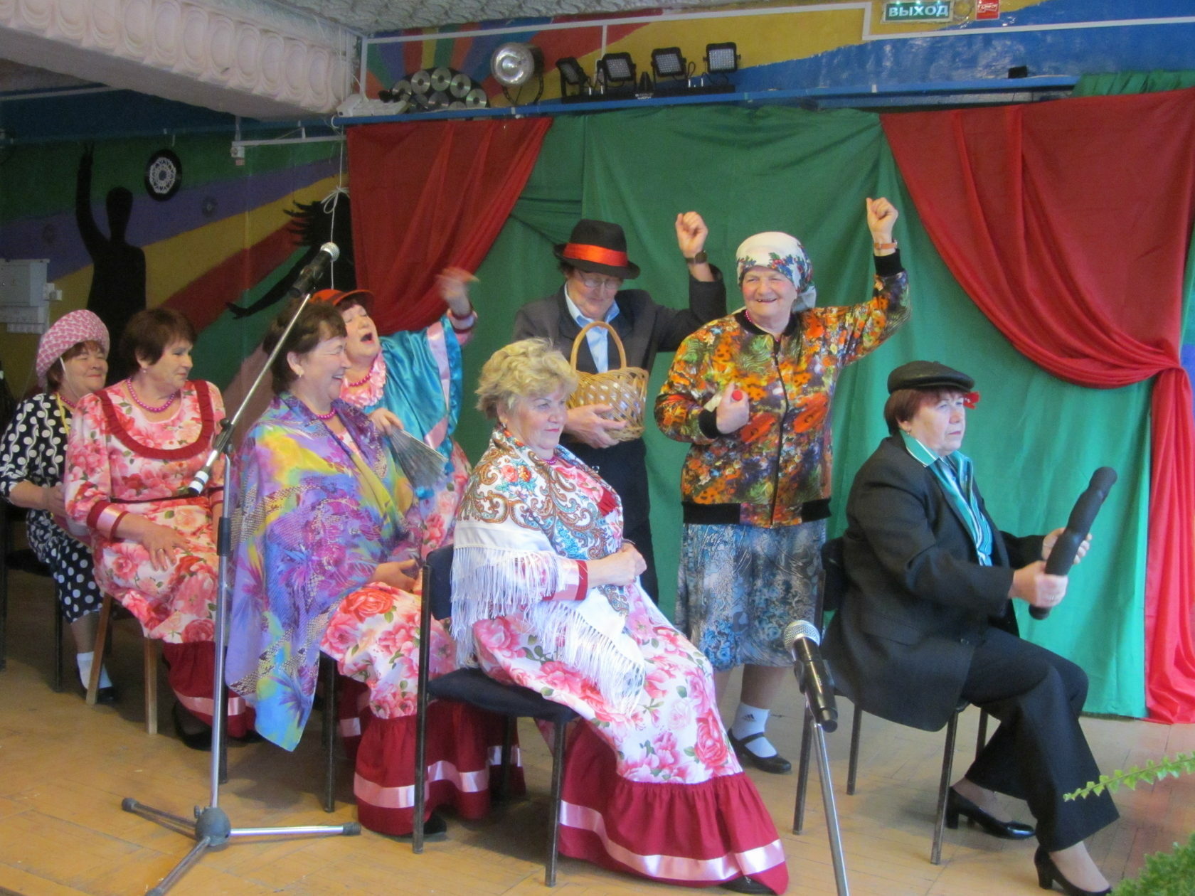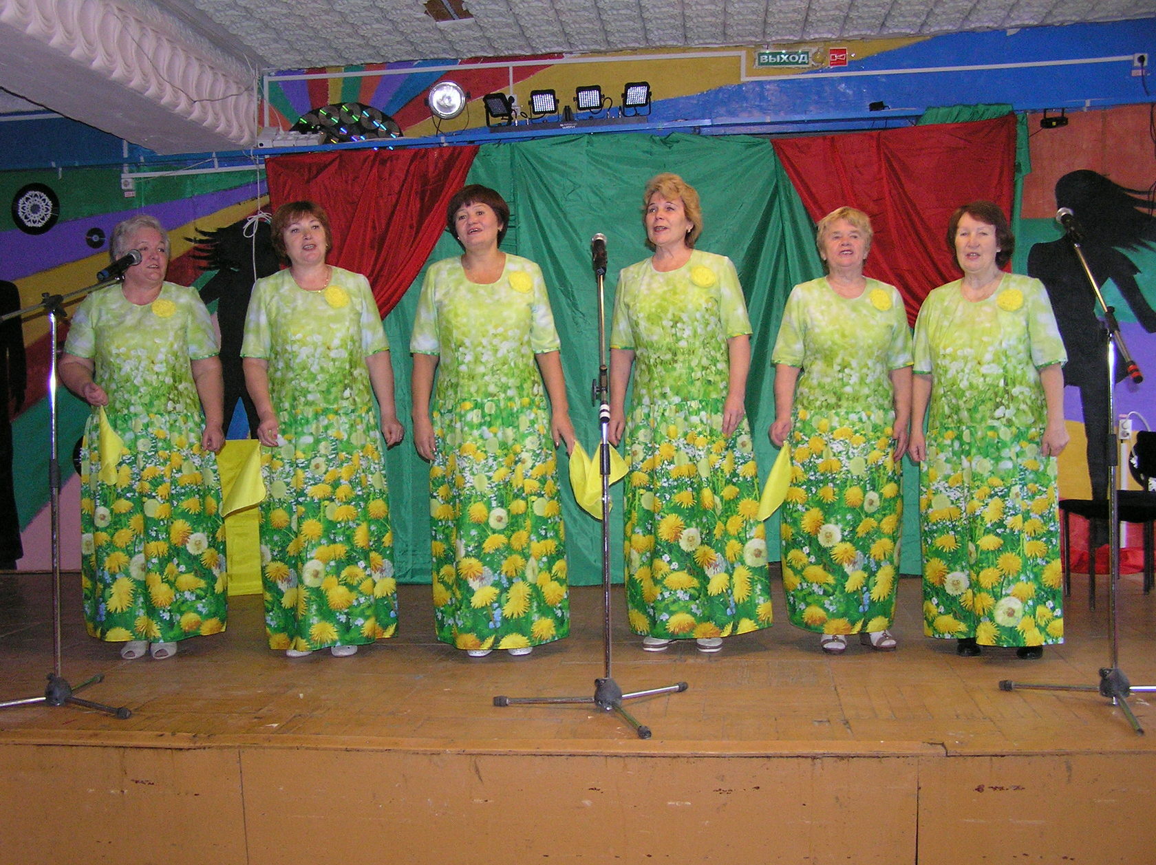 Участницы из клуба «Оптимист» начали своё выступление с физкультурной разминки и продолжили исполнением лирических песен. Особенно зрителям понравилась песня «Одуванчики» в подобранных к теме песни длинных платьях с одуванчиками.
