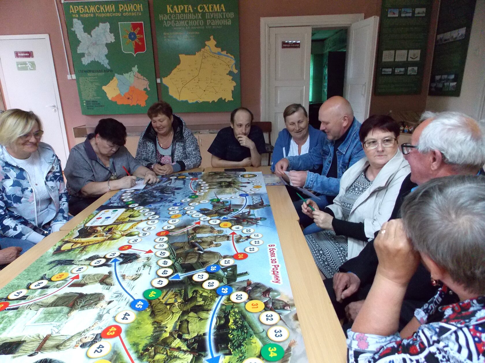 Между первой и второй интеллектуальной игрой между командами пенсионеров в недавно созданном клубе "Мыслитель" прошел ровно месяц. На этот раз игра проходила в Арбажском краеведческом музее и называлась "В боях за Родину". Это познавательная программа с проведением настольной игры. Игра создана в рамках проекта "Эстафета Памяти 311 дивизии - 2", поддержанного Фондом президентских грантов. Две команды "Суперстар" и "Экстрим" показали свои знания по истории Великой Отечественной войны; уверенно давали ответы на исторические, музыкальные и фотовопросы. Молодые волонтеры культуры, старшеклассники Александр Ляпков и Максим Егоров, сопроводили игру увлекательным рассказом про боевую технику! В конце мероприятия председатель районной организации ветеранов Токмянина Любовь Геннадьевна провела награждение - призы (сувенирная продукция с видами поселка Арбаж) получили все! Участники игры одобрили такую форму досуга для людей пожилого возраста и ждут новых встреч. А идеи уже есть!