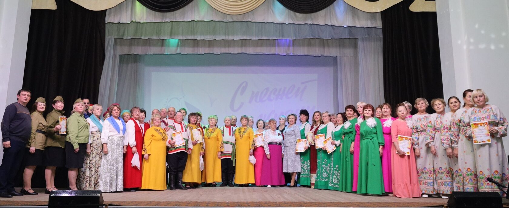 24 октября в ДК »Меридиан» состоялся очный этап гала-концерта районного фестиваля-конкурса творчества ветеранских коллективов, посвященный 80 - летию Великой Победы и Году защитника Отечества. Общее число выступавших на сцене участников – 71 человек. Самым старшим участникам фестиваля - 91 год, это Павел Филиппович Семушин и Шаклеин Николай Иванович, что лишний раз подтверждает слова из песни «Что мне года, если я душою молод».Участниками гала – концерта районного фестиваля – конкурса были 8 творческих ветеранских коллективов с участием из п. Семушино, с. Суна, г. Зуевка, п. Кордяга, п. Косино, с. Мухино, п. Октябрьский, п. Соколовка. Ветераны выступали весело и задорно, концерт прошел на одном дыхании. Зрители встречали ветеранов аплодисментами, кричали «Браво!». Каждый коллектив показывал в своём творчестве что-то интересное. По итогам фестиваля самодеятельные ветеранские коллективы получили Дипломы. Первое место заняли ветераны г.Зуевка «Молодые сердца» и «Верные друзья». Благодарим творческие коллективы за их мастерство, патриотизм и участие в фестивале. А творческий коллектив Дома культуры «Меридиан» г. Зуевка – за прекрасно подготовленное мероприятие, за теплый прием артистов и зрителей.