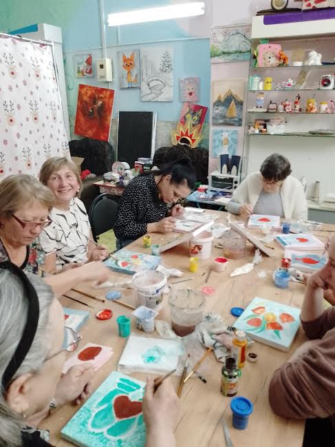 В выходные часть танцевального коллектива «Диво» посетили творческую мастерскую Елены Чадаевой. Елена провела мастер-класс по изготовлению ключницы. Каждому участнику было предложено разрисовать заготовку. Мастер-класс уже второй по счету у представительниц «серебряного» возраста. Работа кисточкой с красками доставила им большое удовлетворение. Час пролетел незаметно и завершился он чашкой ароматного чая с пирожками и тортиком.