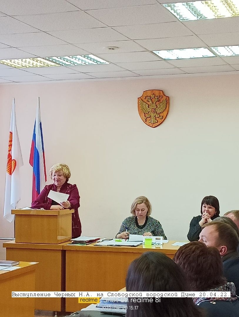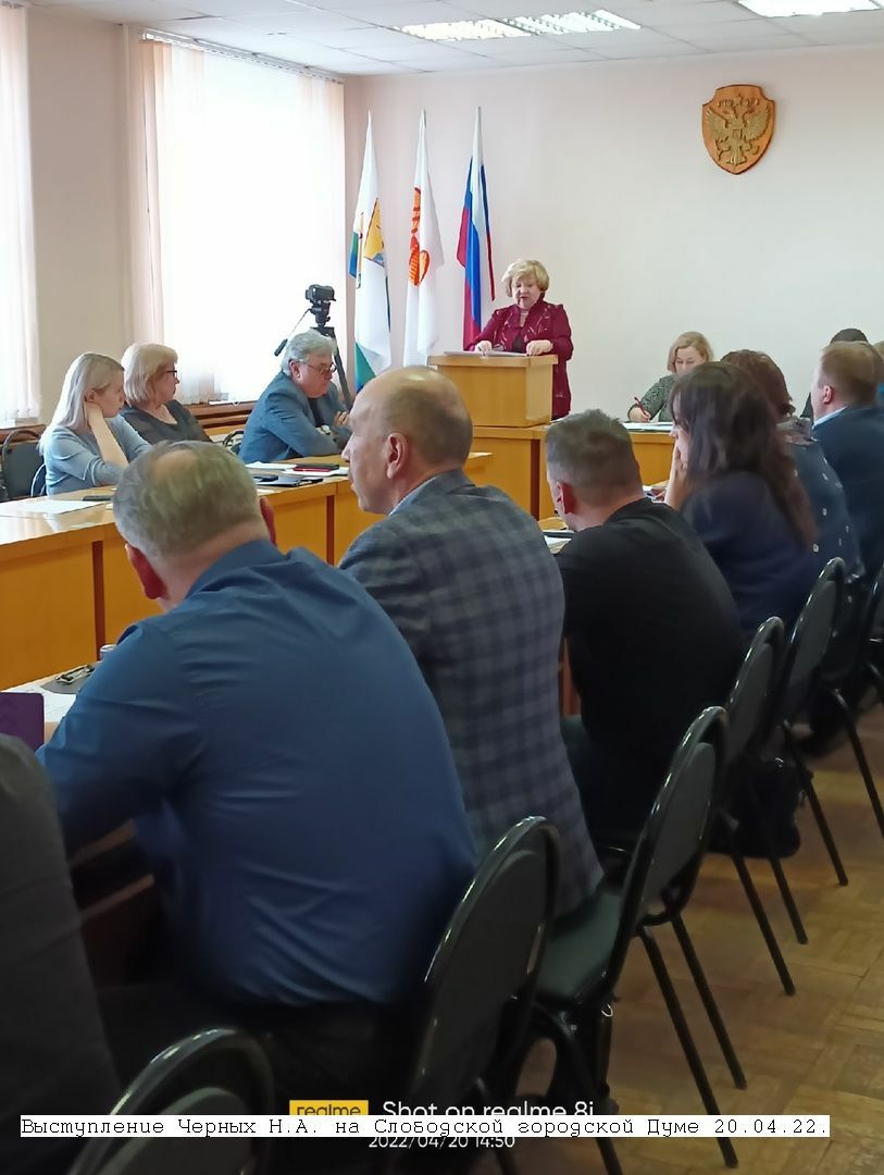 20 апреля 2022 года на заседании Слободской городской Думы в разделе «Вопросы социальной политики» была заслушана о работе председатель Слободской районной организации ветеранов Наталья Аркадьевна Черных. Это был плановый вопрос. Она ежегодно докладывает депутатам о деятельности организации. В этом году Наталья Аркадьевна коснулась вопросов истории ветеранского движения, задач, которые приходилось решать в прошлые годы и которые появляются сейчас. Остановилась на участии ветеранских организаций города и района в проектах местных инициатив, в проектах, инициированных депутатом Государственной Думы РФ Р.А. Азимовым, в проектах Кировской областной организации ветеранов, в проектах Фонда президентских грантов. Уже 4 раза на реализацию проектов получена серьёзная поддержка Фонда. В прошлом году она составила более 2-х млн.руб. Вся информация сопровождалась видео презентацией. Наталья Аркадьевна рассказала о проекте «Эстафета Памяти 311 дивизии-2», который реализуется в этом году. Об областном конкурсе знатоков истории Великой Отечественной войны среди подростков, пригласила депутатов посетить Музей народной памяти и сразиться в игре «В боях за Родину». Её выступление удостоилось аплодисментов.