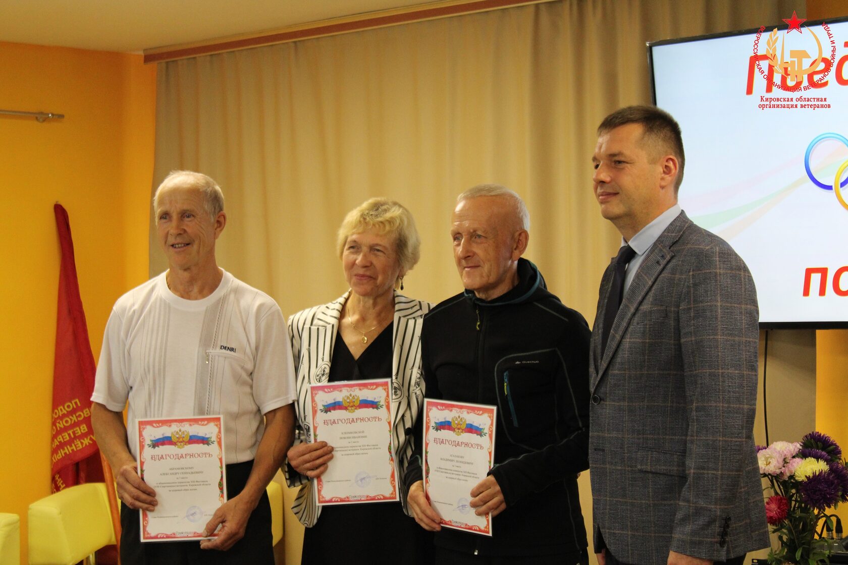С приветственным словом выступил председатель областной организации ветеранов А.А. Галицких, подробнее рассказал о проекте «О спорт! Ты – радость!», вручил Почетные грамоты областной организации спортсменам-ветеранам, а также передал для районной организации ветеранов от имени депутата Государственной Думы Р.А. Азимова подарочный сертификат на 10 000 рублей на приобретение спортивного инвентаря в магазине «Спортмастер».