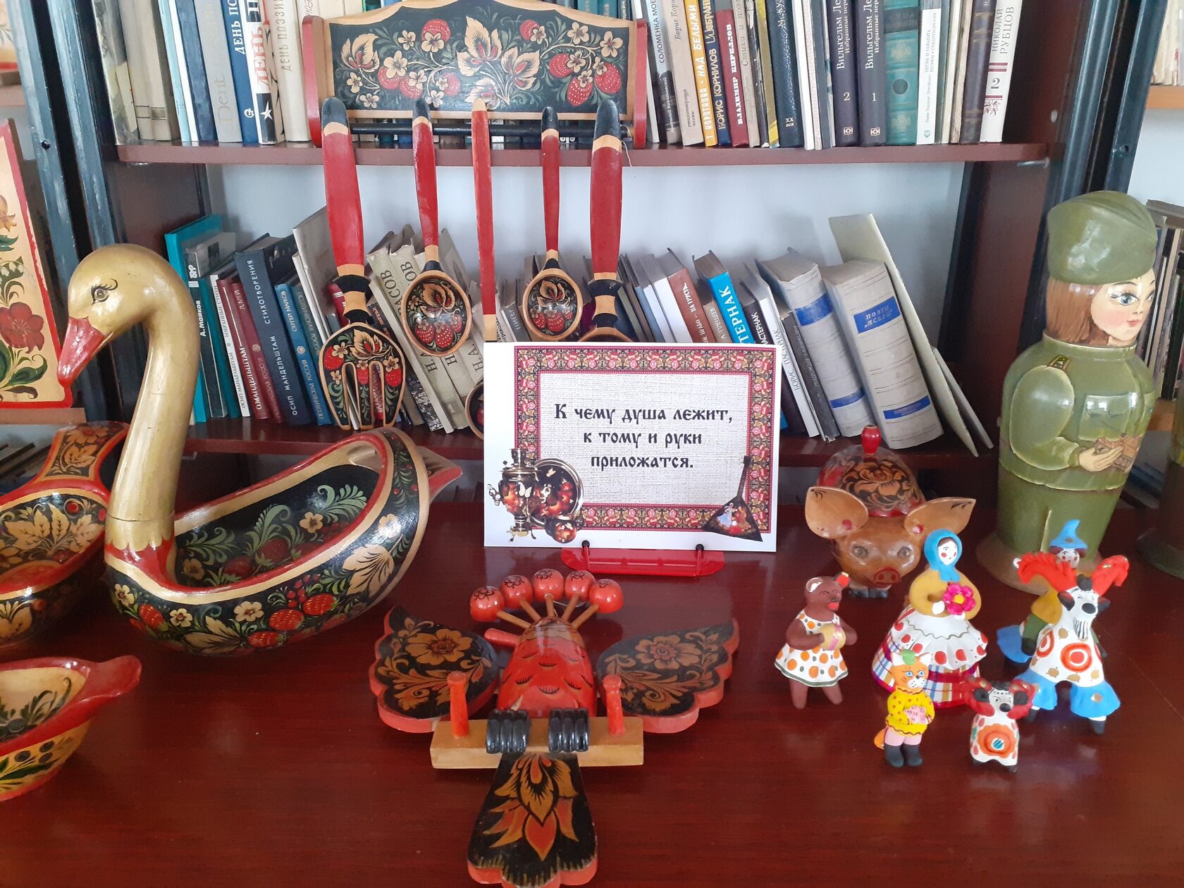 Сейчас в читальном зале библиотеки оформлена новая выставка Тамары Васильевны «Разноликие узоры» (роспись по дереву). На ней представлены расписные доски, деревянная посуда под «хохлому», кухонные наборы с разноцветными ложками, красивые шкатулки с уржумскими пейзажами и изюминка выставки – «семья» из восьми матрешек.