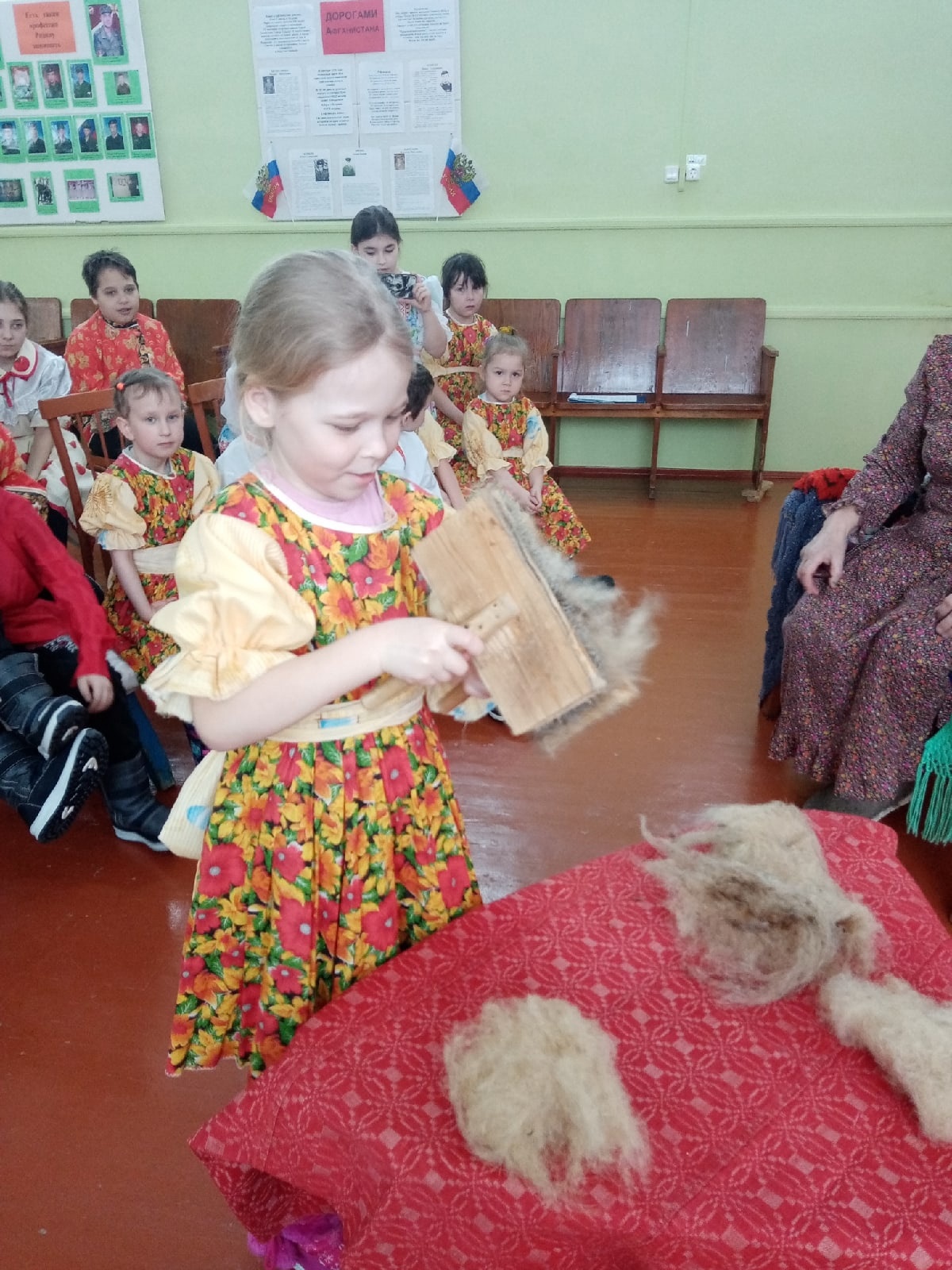 Интересно было всем! Ведущие познакомили с убранством старинной русской избы, предметами быта, показали, как и для чего они использовались. Взрослым было приятно вспомнить свое деревенское детство, своих матерей и бабушек, а детям очень хотелось попробовать все своими руками. Они чесали шерсть на щетках, пробовали прясть, нести ведра на коромысле: многие детишки до этого дня даже не знали назначения этих предметов! «Бабушка Федора», она же ветеран педагогического труда, активный участник ветеранской организации Кузнецова Клавдия Григорьевна, с удовольствием рассказывала о домашних рукоделиях женщин и даже провела мастер-класс по вязанию половиков и салфеток.
