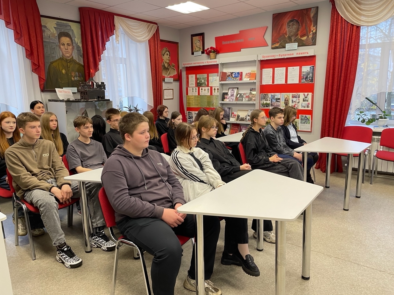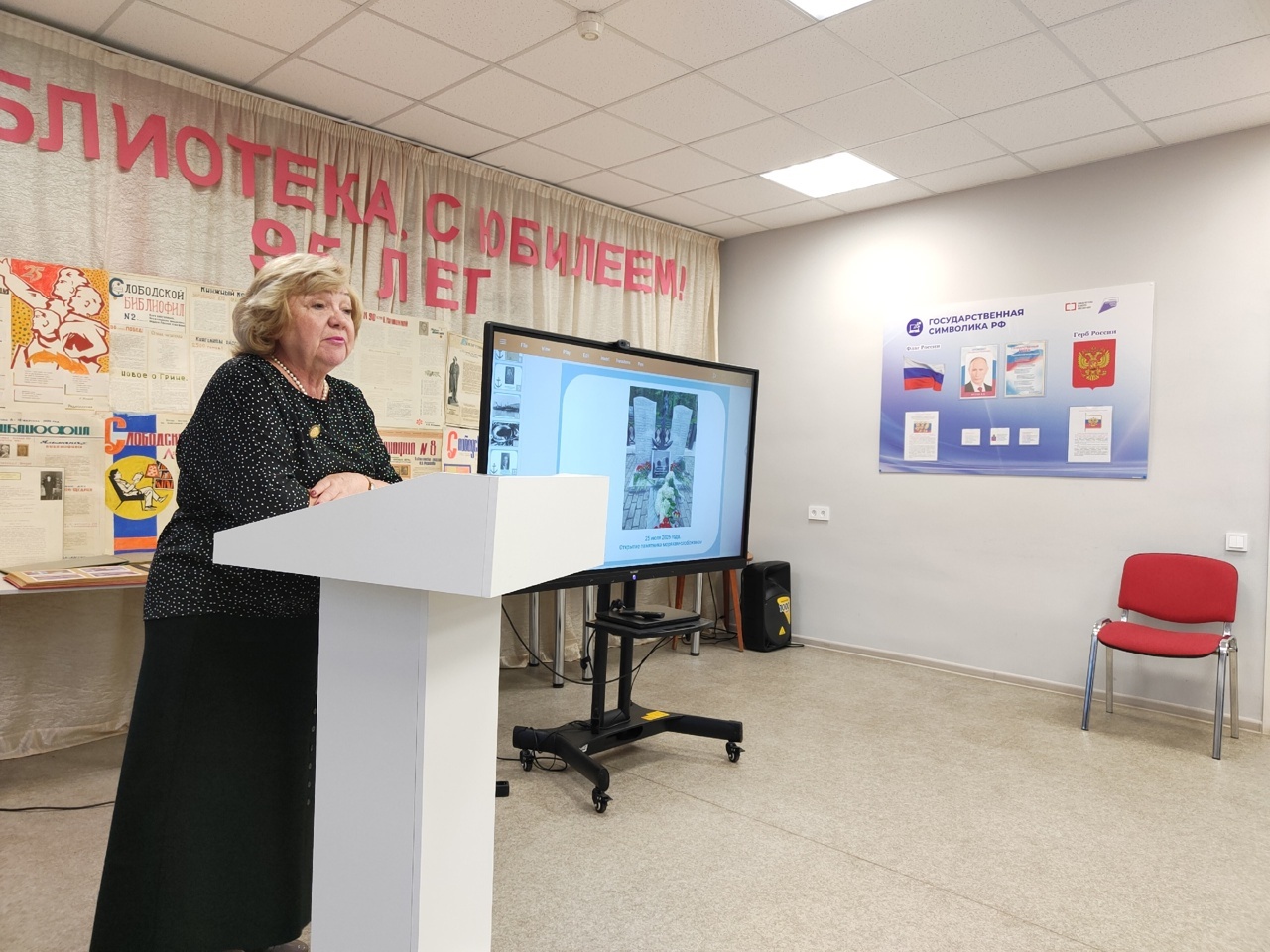 Наталья Аркадьевна напомнила девятиклассникам, что в Год защитника Отечества, при активном участии ветеранской организации, в нашем городе появились новые памятные места: памятник детям войны и труженикам тыла, памятник знаменосцу Победы Григорию Булатову и памятник морякам-слобожанам, отдавшим жизнь за Родину в годы Великой Отечественной войны.