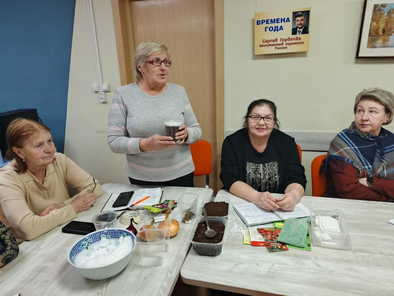 Затем занятие продолжили Нина Александровна Чувакорзина, по специальности ученый-агроном и Любовь Васильевна Меркурьева, опытный цветовод и овощевод. Они провели мастер-класс по посеву земляники и лука на рассаду, рассказали о сортах, которые выращивают сами и о том, как ухаживают за всходами. Особый акцент сделали обе на посев семян по снегу. Пользуясь не первый год таким способом посева, выращивают дружную, крепкую рассаду.