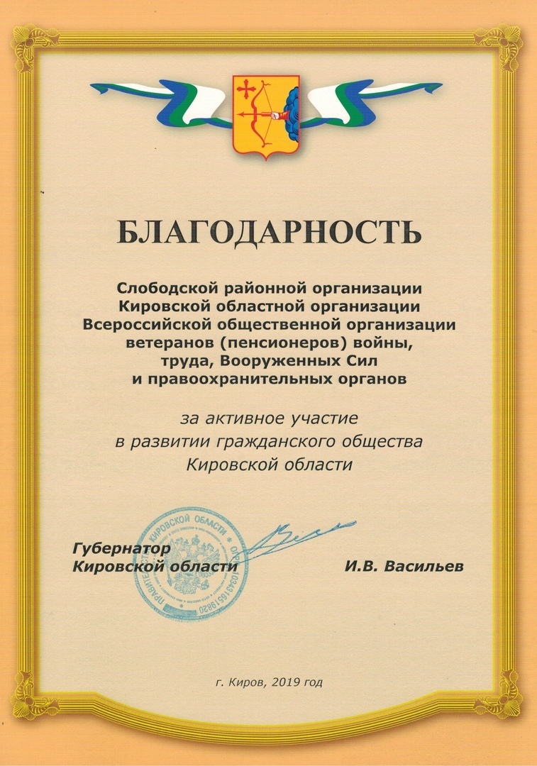 24 июня в здании Правительства Кировской области состоялась встреча Губернатора Кировской области Васильева И.В. с победителями конкурса президентских грантов. От Слободской организации ветеранов на данной встрече присутствовала председатель Совета Черных Наталья Аркадьевна. Слободской организации ветеранов вручена Благодарность за активное участие в развитии гражданского общества Кировской области.