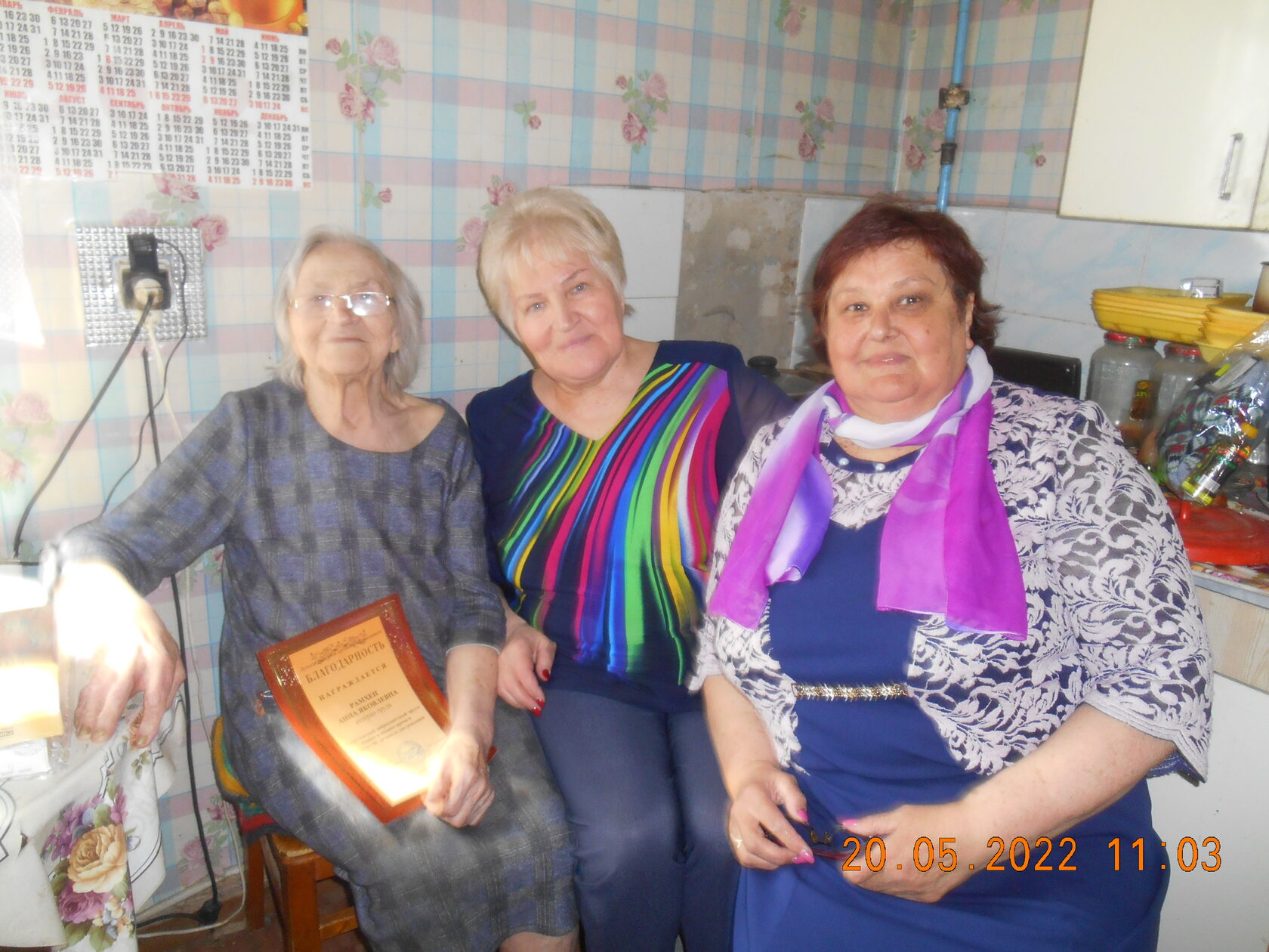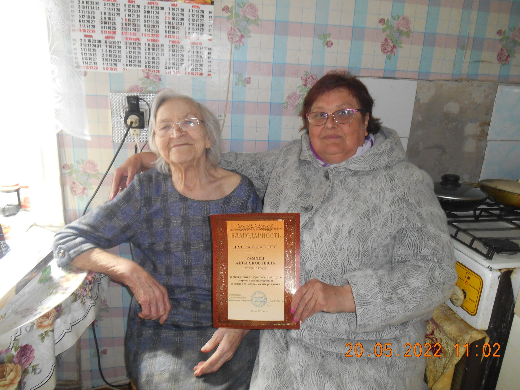20 мая председатель ветеранской организации ЛПК Старцева В. Л. и председатель районной ветеранской организации Субботина Т. Б. поздравили с юбилейным днём рождения (90 лет) труженицу тыла Рамхен Анну Яковлевну, которая 38 лет трудилась в ЛПК. Пожелали здоровья, счастья и долгих лет жизни.