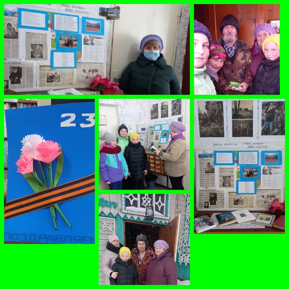 Председатель совета ветеранов вместе с библиотекарем и учащимися школы поздравили мужчин (детей войны и воинов-интернационалистов) с Днем защитника Отечества. Подарили им памятные открытки, сделанные руками ребят во главе с библиотекарем. Накануне в Городищенской библиотеке был оформлен стенд, посвященный детям войны, проживающих в д. Городище и д. Слудка "Век живи - век помни". Большой интерес к стенду проявляли как пенсионеры, так и школьники.