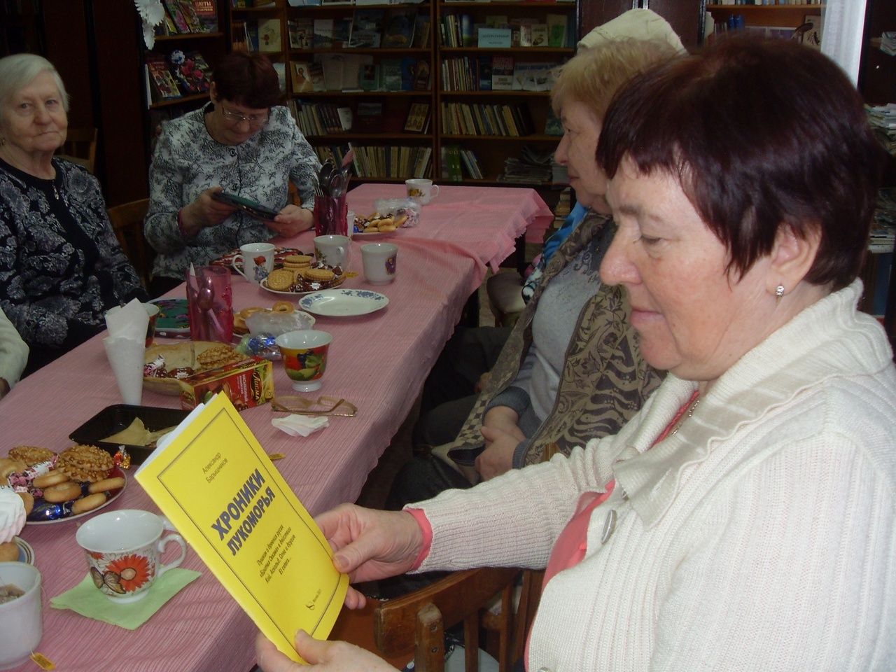 Познакомились с новой книгой нашего земляка Александра Барышникова "Хроника Лукоморья", которую автор подарил библиотеке, а также послушали стихотворение Ларисы Рубальской, посвящённое женщине. Встреча, как всегда, проходила за чашкой чая, а на столе были блины. Раиса Владимировна Шихалеева подарила всем женщинам прихватки, выполненные в технике пэчворк.