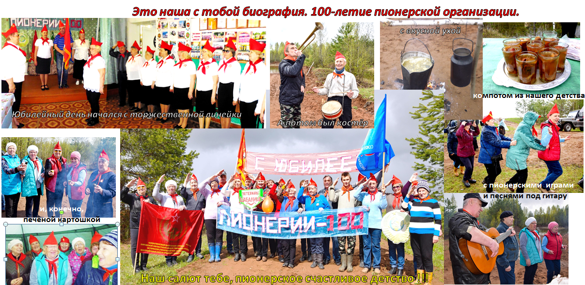 Мы быстренько поставили большой шатёр и в нём, в прямом смысле тесным кружком, вспоминали пионерские песни, играли, смеялись. А потом солнце сжалилось над нами, и всё продолжилось на поляне. Было очень весело, всё вкусно, всё просто замечательно! Конечно, в этот день отмечали по району юбилей пионерии во всех Домах культуры, в библиотеках с участием ветеранов. Праздник прошёл широким шагом и очень громко о себе заявил. Да, историю забывать нельзя.