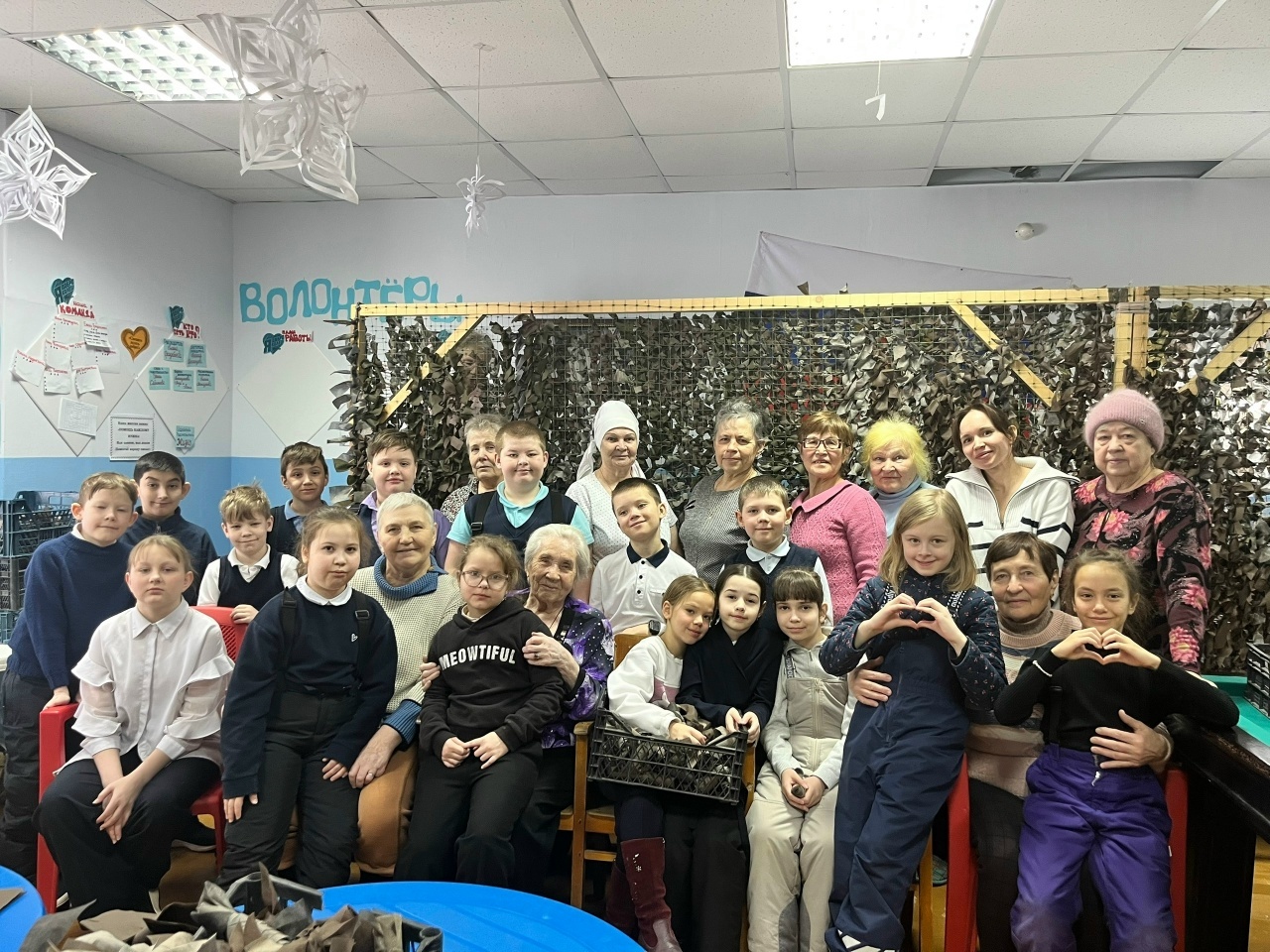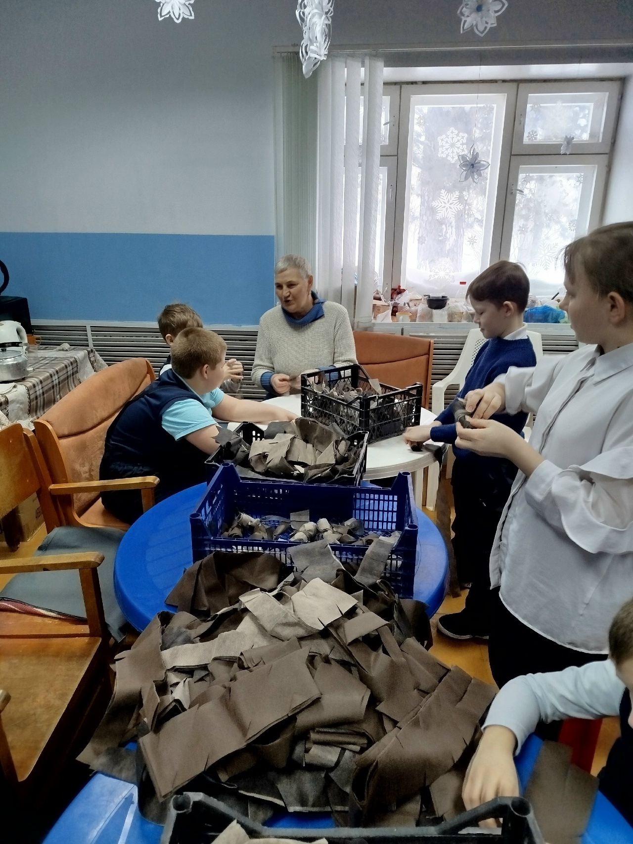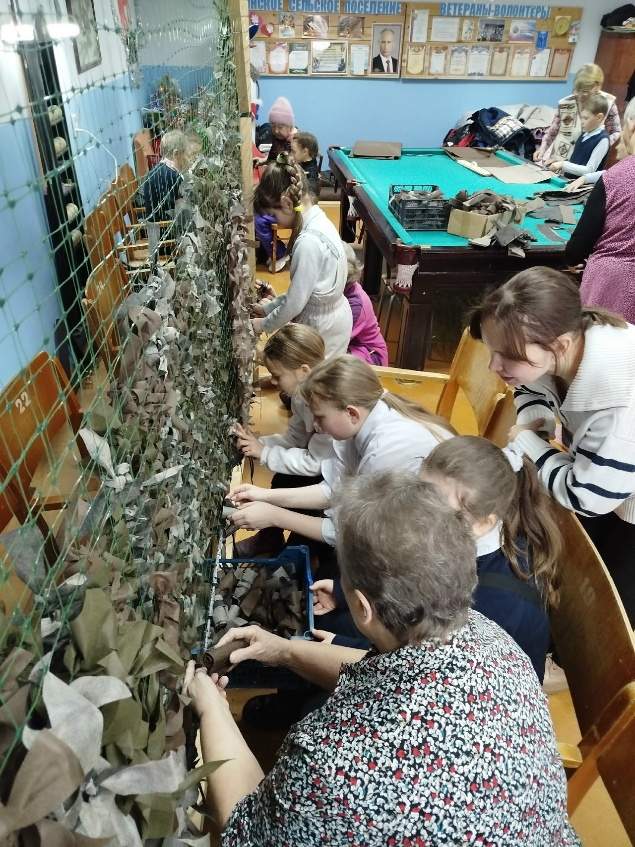 На днях к бобинским волонтёрам в гости пришли учащиеся 3-б класса местной школы. Ребята захотели поучиться плести маскировочные сети. Мастерицы-волонтёры показали, как это делается.