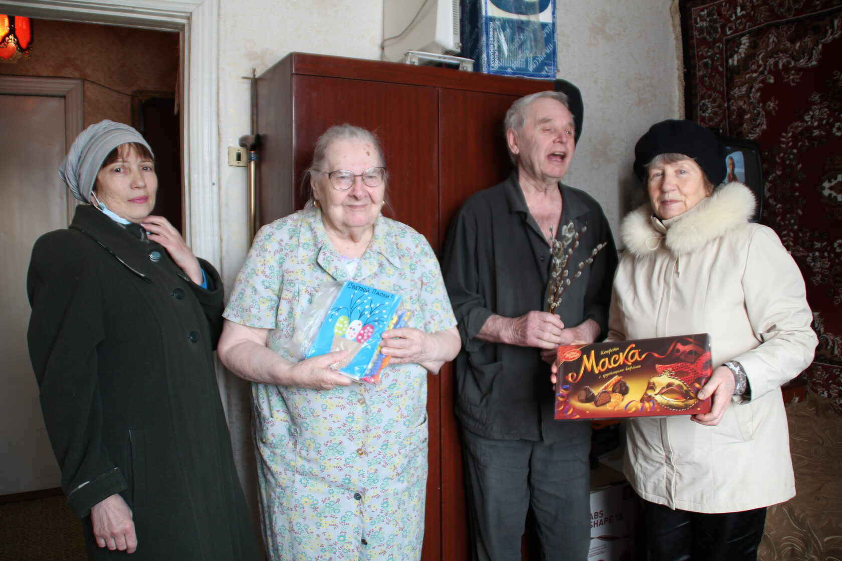 Нашему визиту они были очень рады, хотя заранее их не оповещали. «Очень кстати, нам бы никто не принес», - воскликнула Лидия Васильевна, увидев веточки вербы. В ходе беседы выяснилось, что Андрей Иванович совсем плохо видит и он с супругой давно уже не выходил на улицу. Лидия Васильевна, несмотря на состояние здоровья, не теряя оптимизма, увлеченно стала рассказывать, сколько у нее сортов герани, как она выращивает огурцы на балконе.
